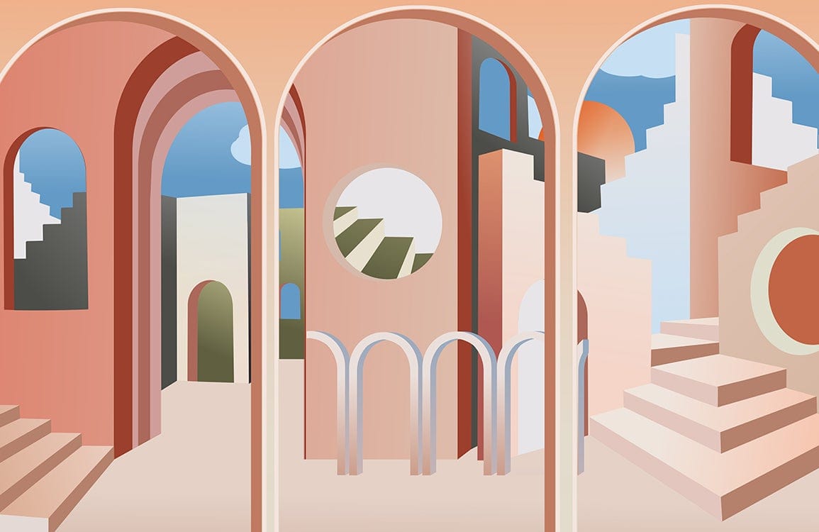 Explore this 3D building wallpaper mural and enhance the atmosphere and dimensions of your space. Partnered with the various pastel colours, this creative 3D wallpaper design is eye-catching and breathtaking. Create an expansive effect and open up your space in your bedroom, bathroom, living area, hallway or home office and use bright or pastel colour furnishing for complimentary decor. Either will be sure to revive your room and exhilarate all who enter.
