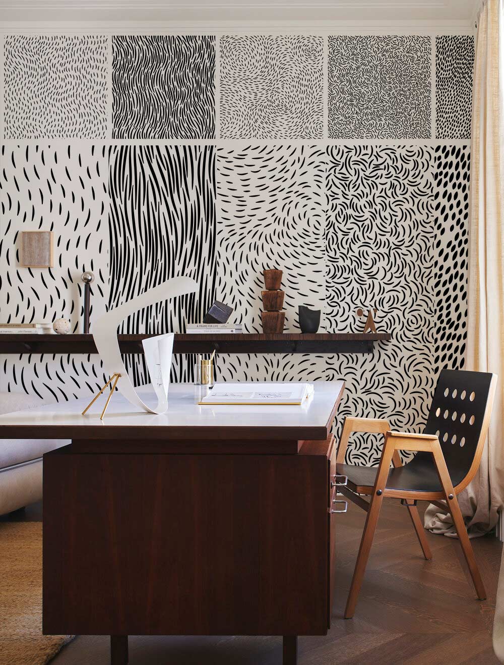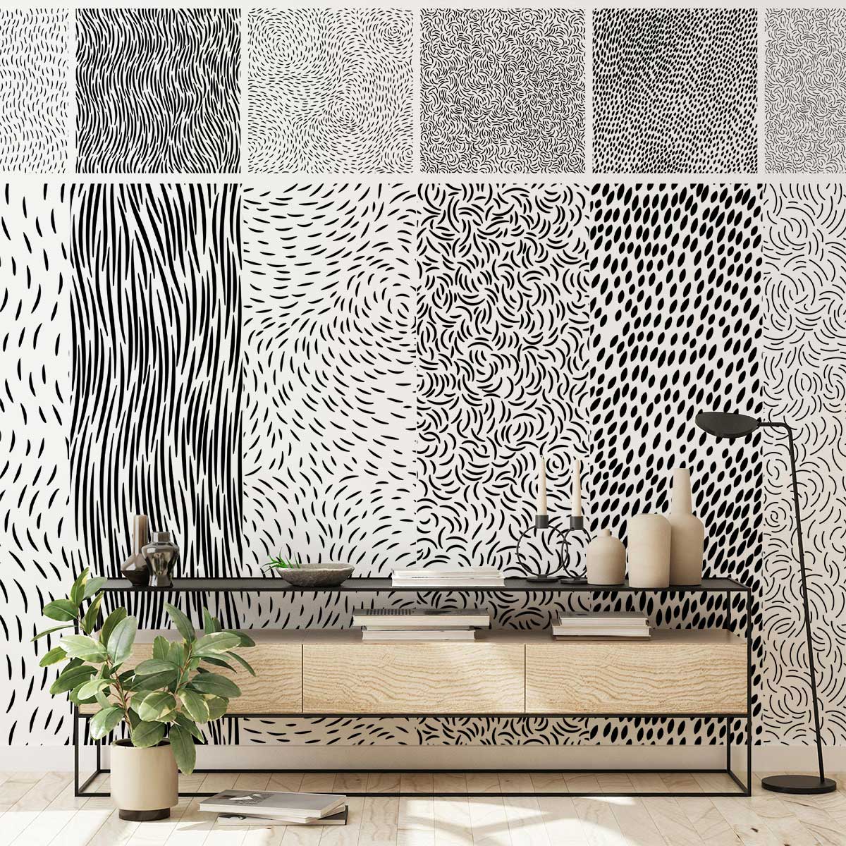 The perfect addition to your home, this Black Lines Wallpaper Mural is a contemporary wall pattern that's sure to make an impact. The striking abstraction of black lines adds an eye-catching element sure to be the focal point of your living room or other space. This sheer, abstract wall mural will bring a trendy yet minimalist look to your space, perfect for any type of interior design style and versatile enough to fit on any coloured walls.