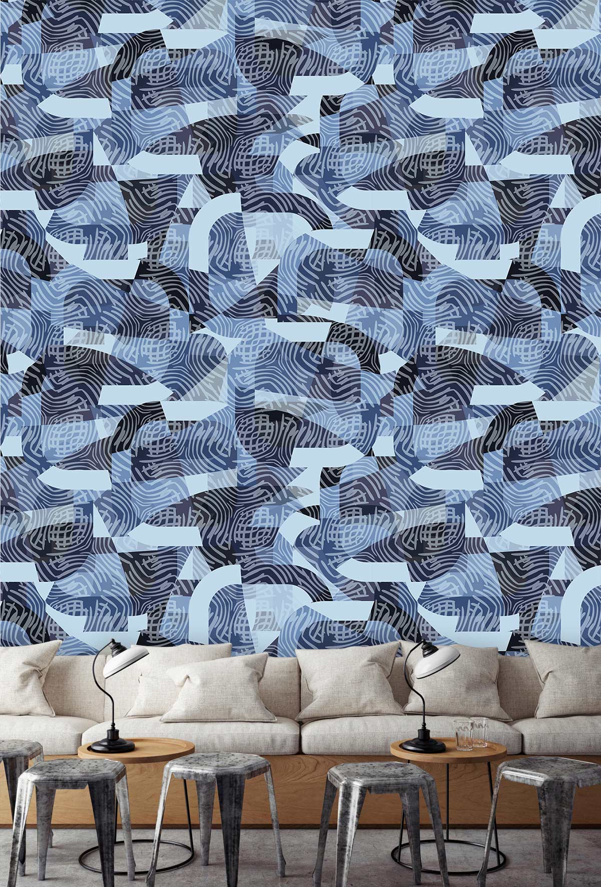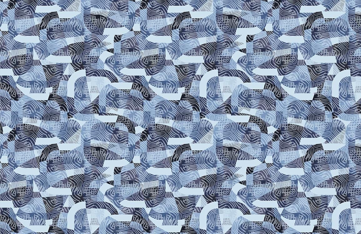 This Abstract Blue Wallpaper Mural captivates with its intricate interplay of geometric patterns and flowing lines. The soothing palette of blues and blacks creates a sophisticated tapestry that exudes both calm and contemporary flair. Vital for accentuating living spaces, it evokes a sense of endless horizon and artistic elegance, perfectly complementing a range of interiors from the modern to the minimalist.