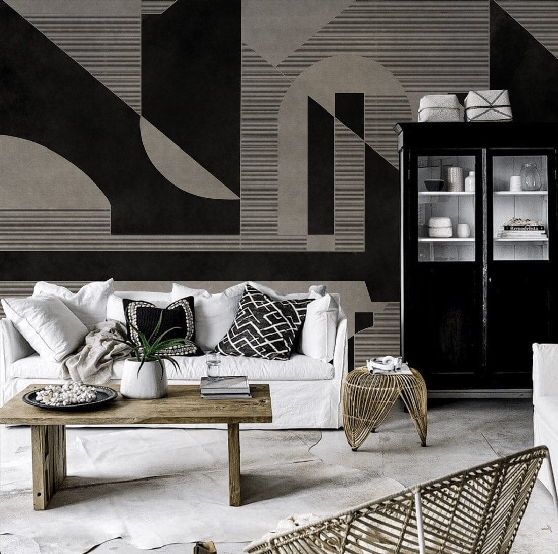 Elegance takes form in this abstract geometric mural wallpaper, where bold lines and curves converge in striking black and grey tones. Its sophisticated pattern breathes an artistic flair into any space, offering a timeless aesthetic. Ideal for spaces yearning for a touch of artistic sophistication, this mural complements modern interiors while embracing a hint of minimalism.