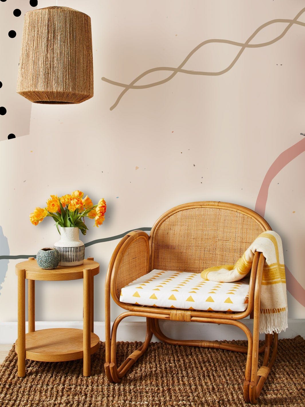 A simple design brings together abstract lines, abstract doodles, and creative patterns that is modern, colourful, and impactful. With ivory white,?pastel pinks, dusty blues and black dots, the tones of this piece help bring the mural to life and will help to open up your space. Use this design with any decor in a bedroom, living room, dining room, and hallway.