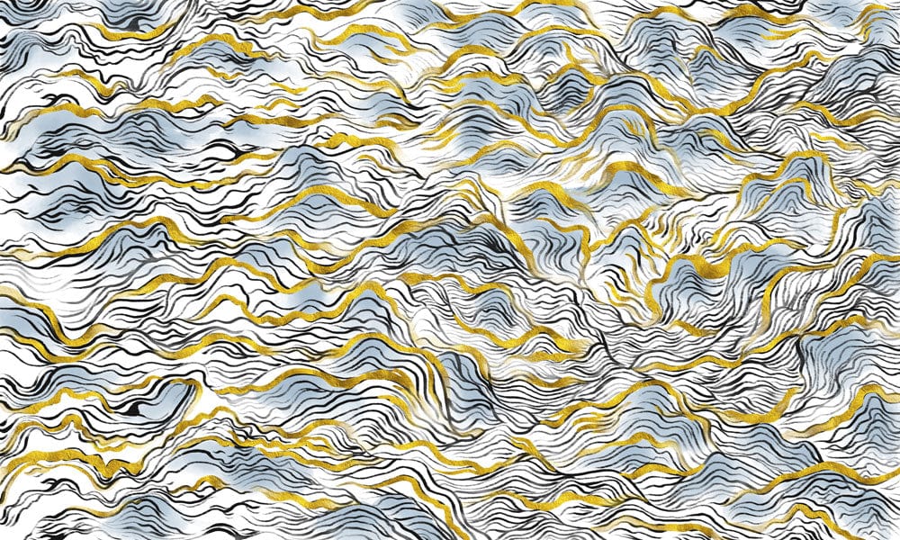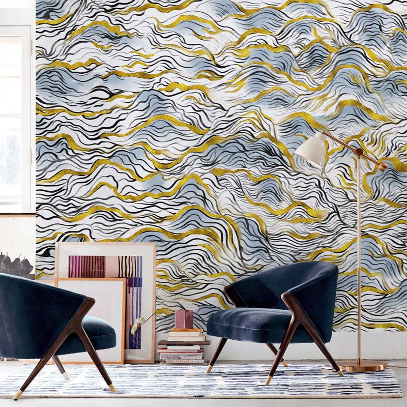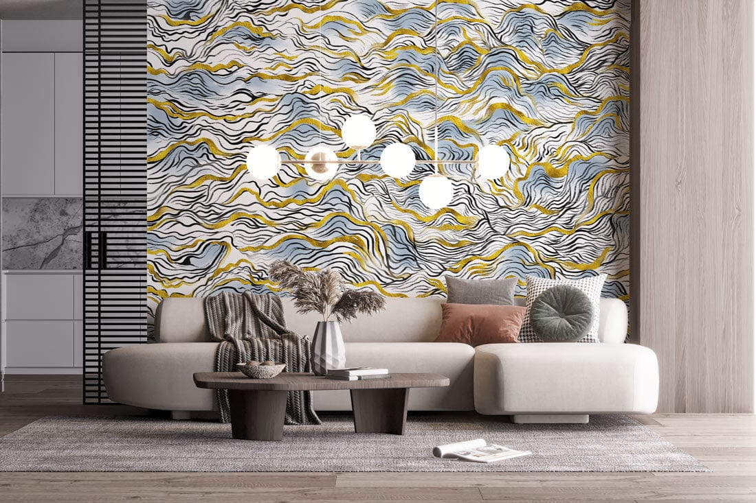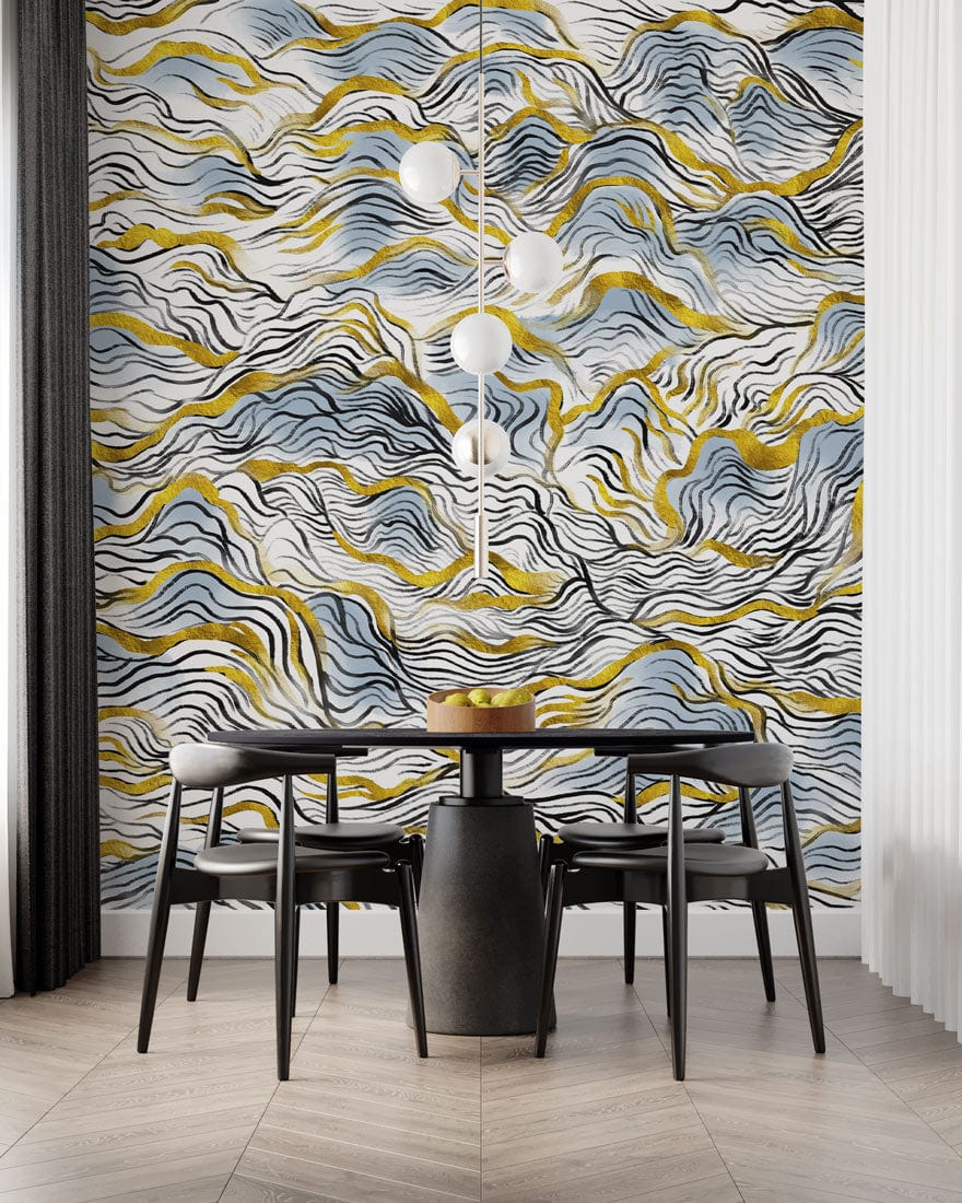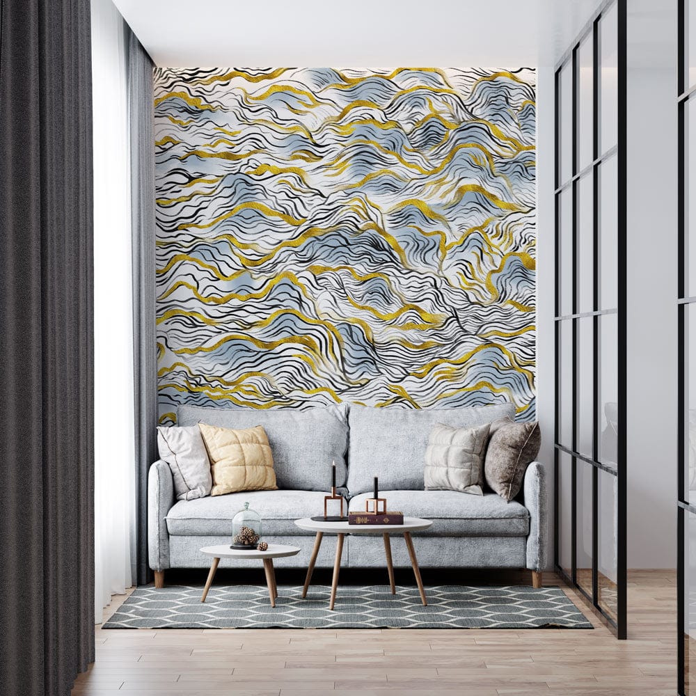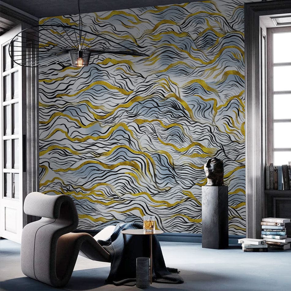 The Abstract Mountain Wallpaper Mural captures the serene elegance of nature with its fluid lines and harmonious tones. The design evokes a sense of calming movement, effortlessly weaving golden, blue, and black hues into an intricate tapestry of peaks and valleys. Its artistic allure and sophisticated texture make it a timeless choice for adding depth to any space, from sleek living rooms to serene bedrooms or creative office environments.
