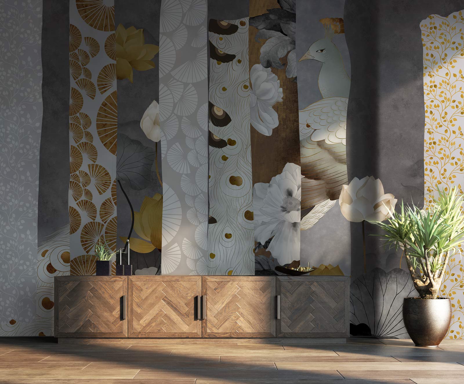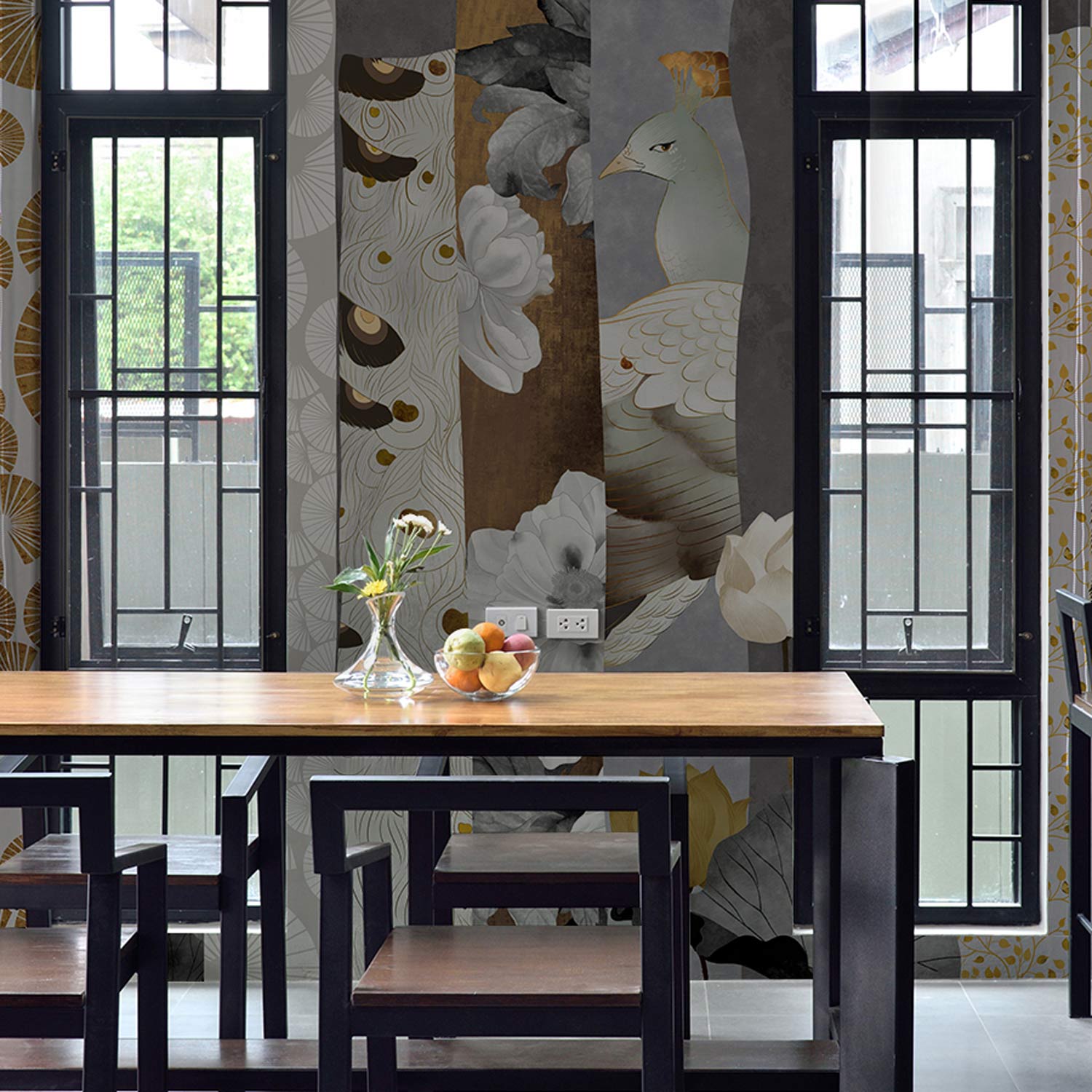 This Art Deco Wallpaper Mural weaves a narrative of elegance and luxury with its intricate patterns and vibrant textures. A harmonious blend of peacock motifs, blooming florals, and geometric designs evokes the opulence of the Roaring Twenties. Subtle tones of gold, ivory, and charcoal infuse your space with a refined charm, making it a striking feature in any room. Its timeless allure complements both contemporary and vintage settings, offering a sophisticated yet inviting ambience.