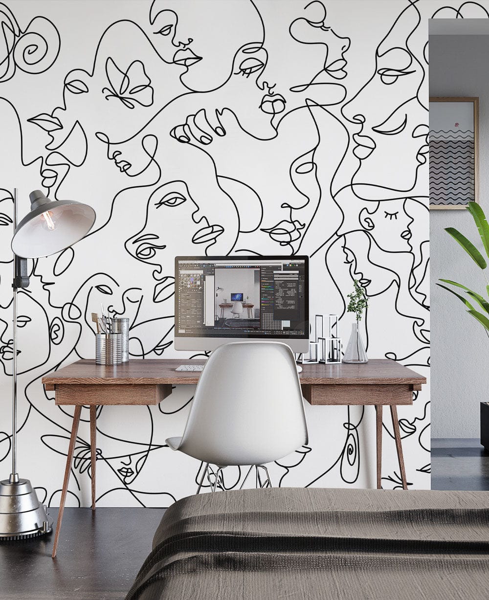 Immerse any space in artistic elegance with this Abstract Portrait Lines Wallpaper Mural. Featuring an intricate array of continuous line drawings showcasing faces and figures, this mural brings a sense of poised sophistication to your home or office. The subtle and refined design, accentuated by its monochromatic palette, seamlessly integrates with various interior styles and adds a timeless touch to your walls.