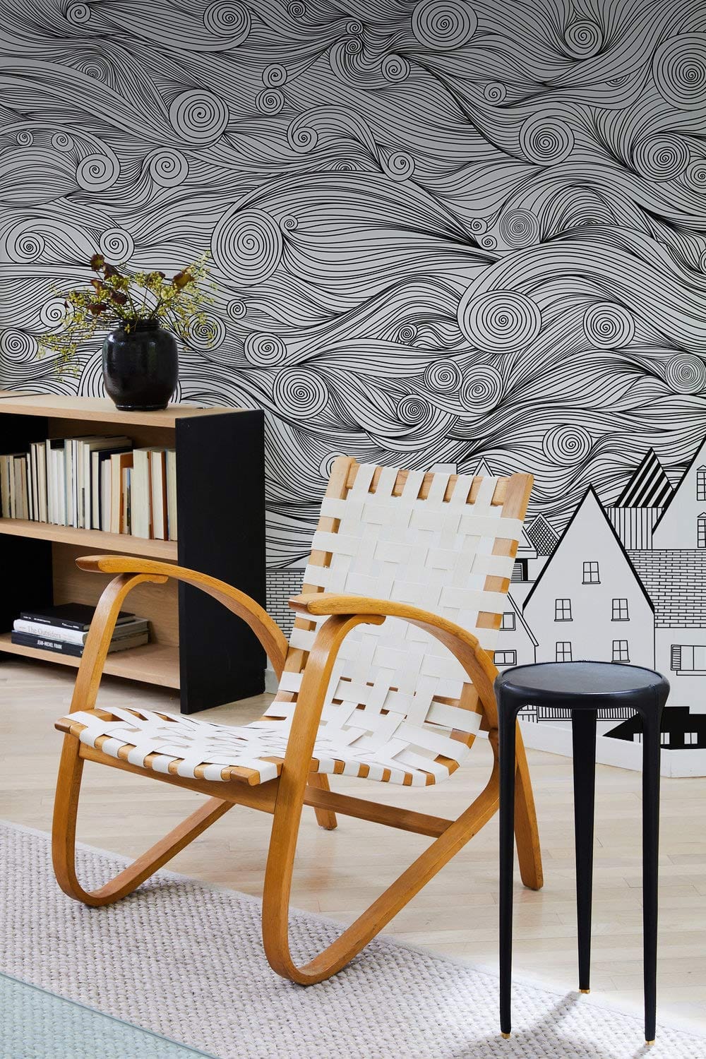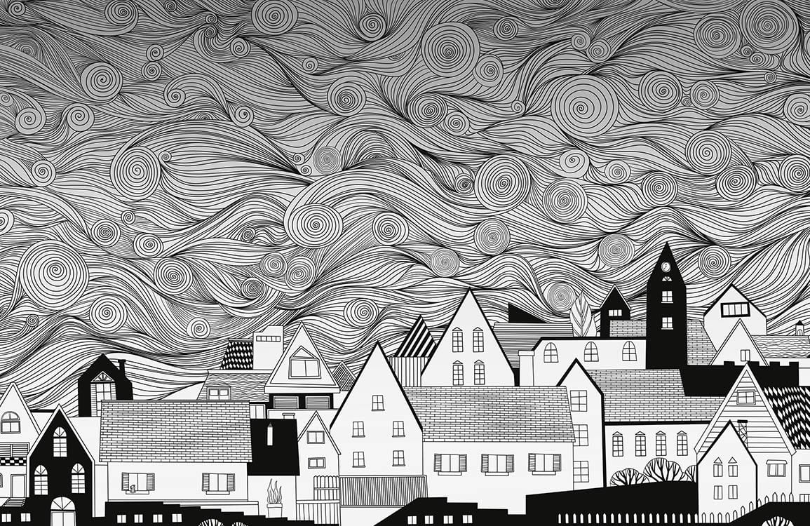 Abstract Sky II Wallpaper Mural captures the whimsical essence of a swirling night sky over a charming village silhouette. Its intricate line work and dynamic swirls create a visual tapestry that effortlessly invites a sense of movement and intrigue. This mural offers a sophisticated yet playful backdrop, perfect for those seeking a balance of elegance and artistic flair in their interiors.