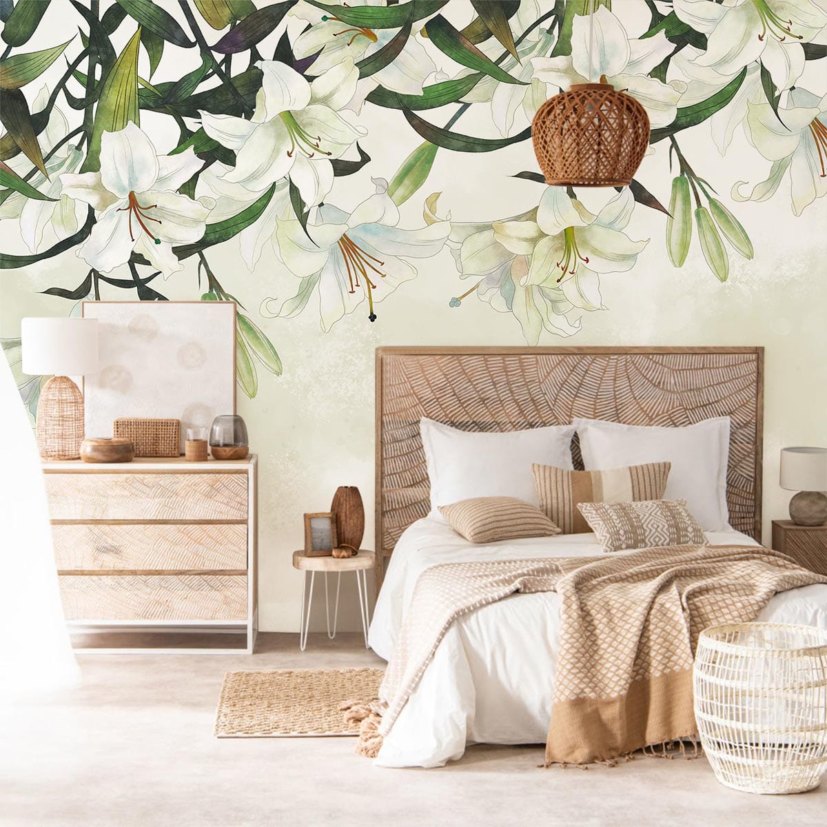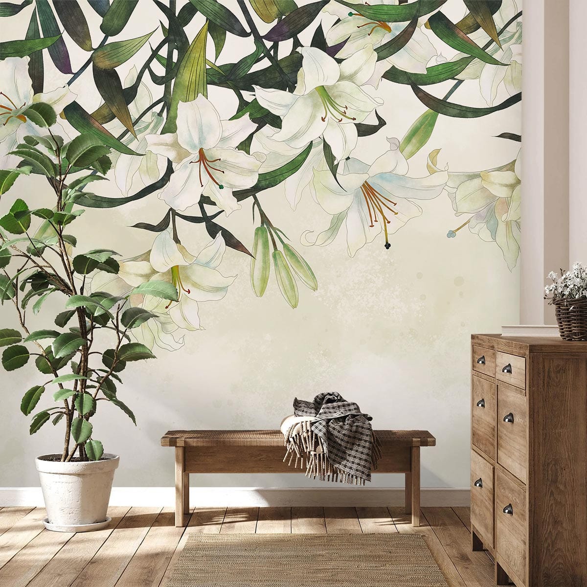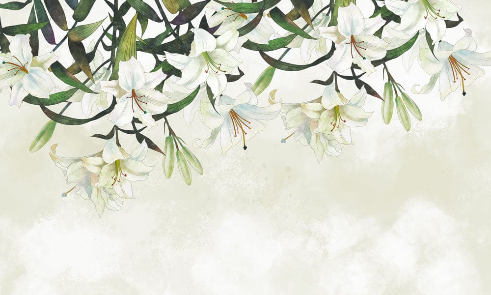 Immerse yourself in the graceful elegance of the Under the Lily Wallpaper Mural, where delicate white lilies cascade against a soft, misty background. The intricate details of the blossoms and leaves imbue a serene and timeless charm, making it an exquisite choice for both classic and contemporary settings. Whether adorning a living room or a tranquil office space, this mural infuses an atmosphere of refined beauty and subtle sophistication.