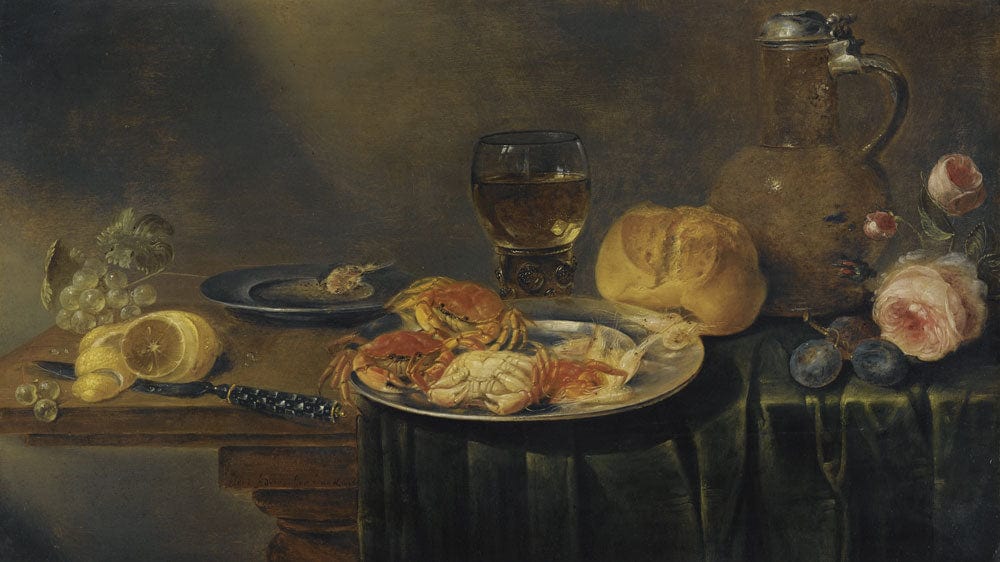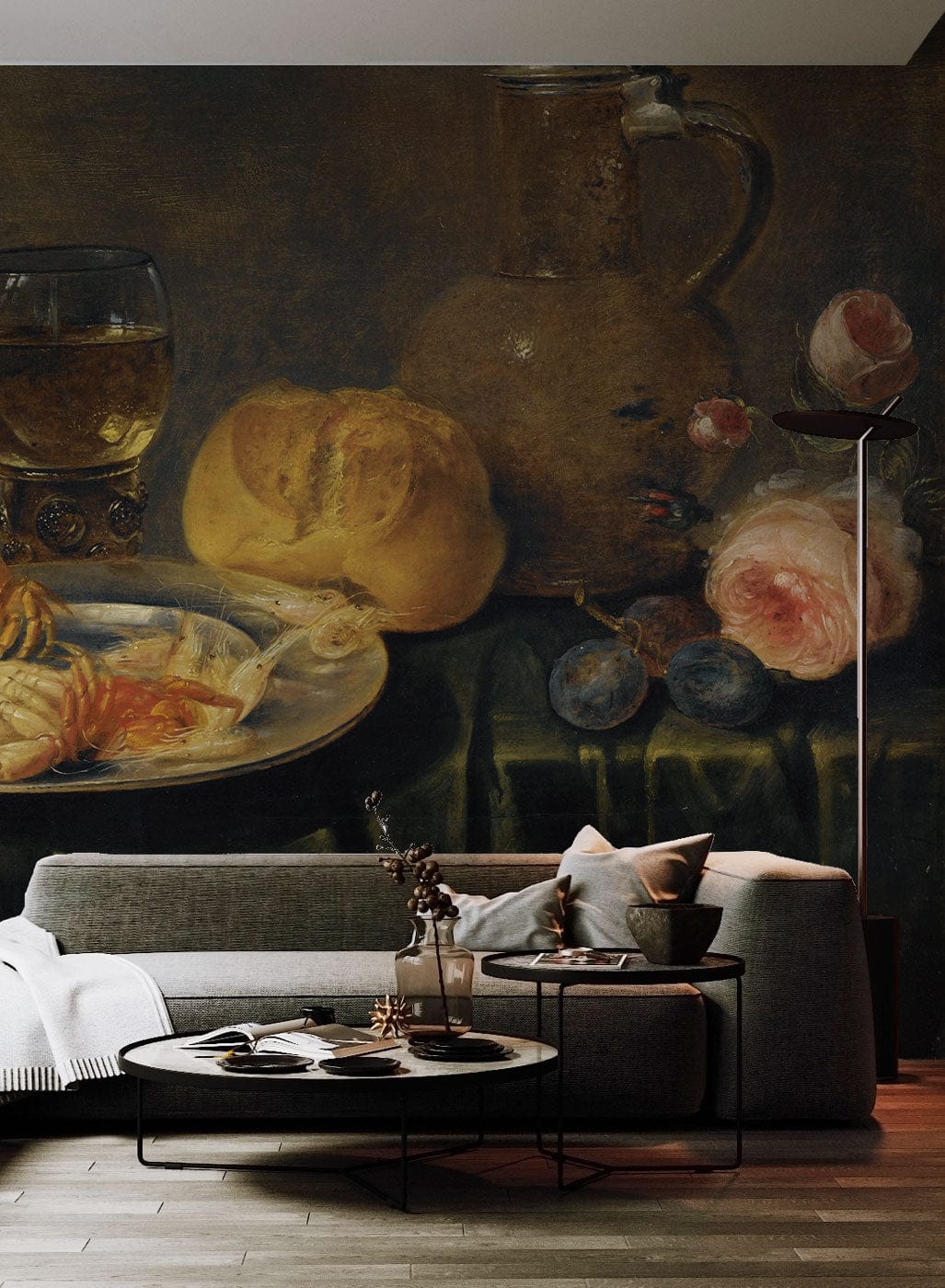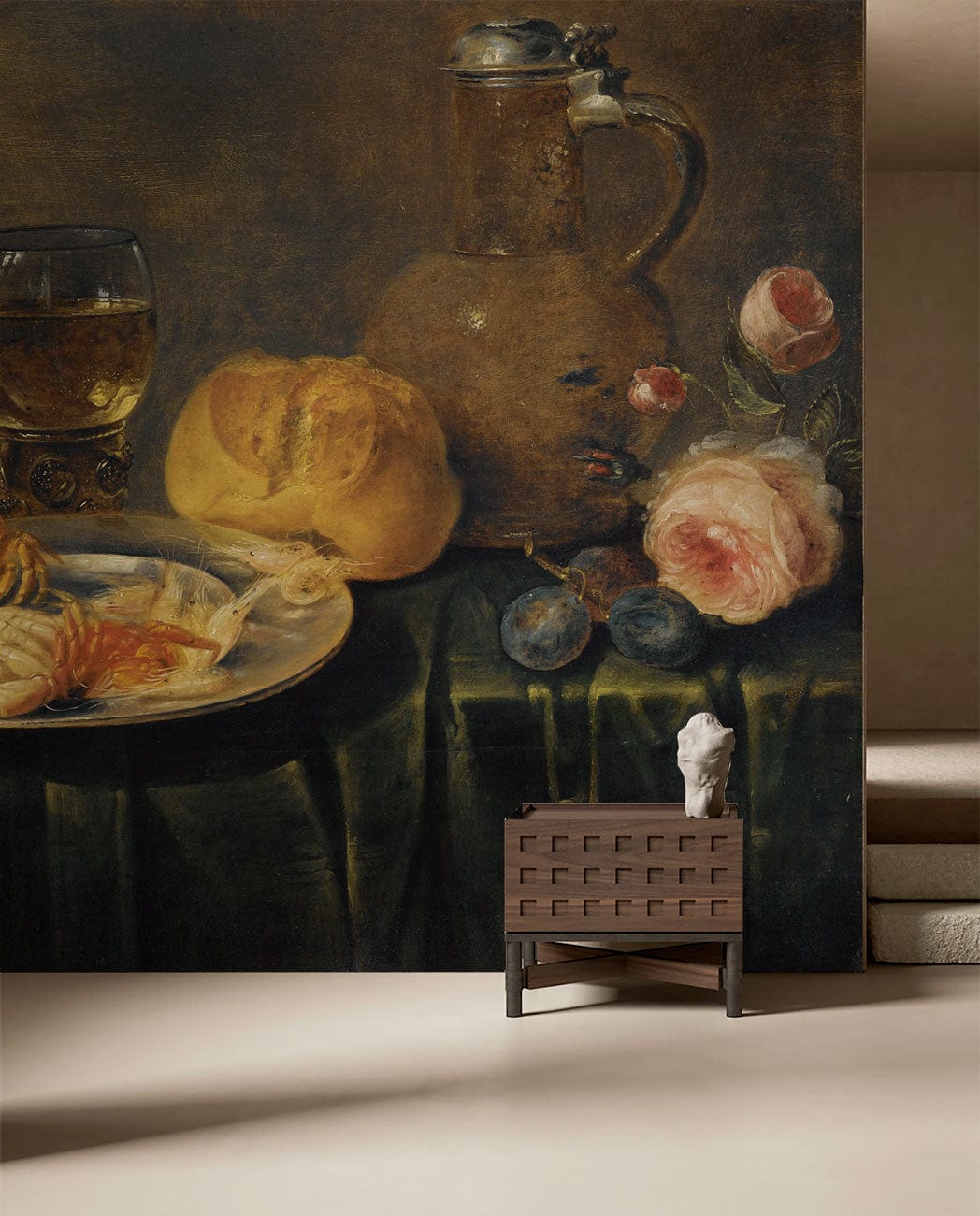 This exquisite Alexander Adriaenessen painting wallpaper mural evokes the elegance of a timeless still life. Captured in rich detail, the depiction of succulent sea creatures, ripe fruit, and delicate roses lends an air of refined opulence to any interior. The deep, luxuriant hues create a warm, inviting atmosphere, making it a distinguished centrepiece suitable for any sophisticated setting.