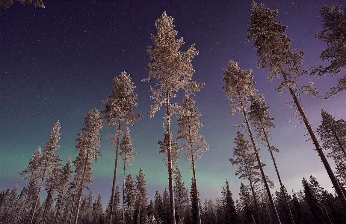 Embrace serene elegance with the Aurora above Forest Wallpaper Mural, where towering trees reach into a captivating night sky illuminated by ethereal auroras. This mural combines nature's tranquillity with a sophisticated artistic flair, seamlessly integrating into contemporary or classic interiors.