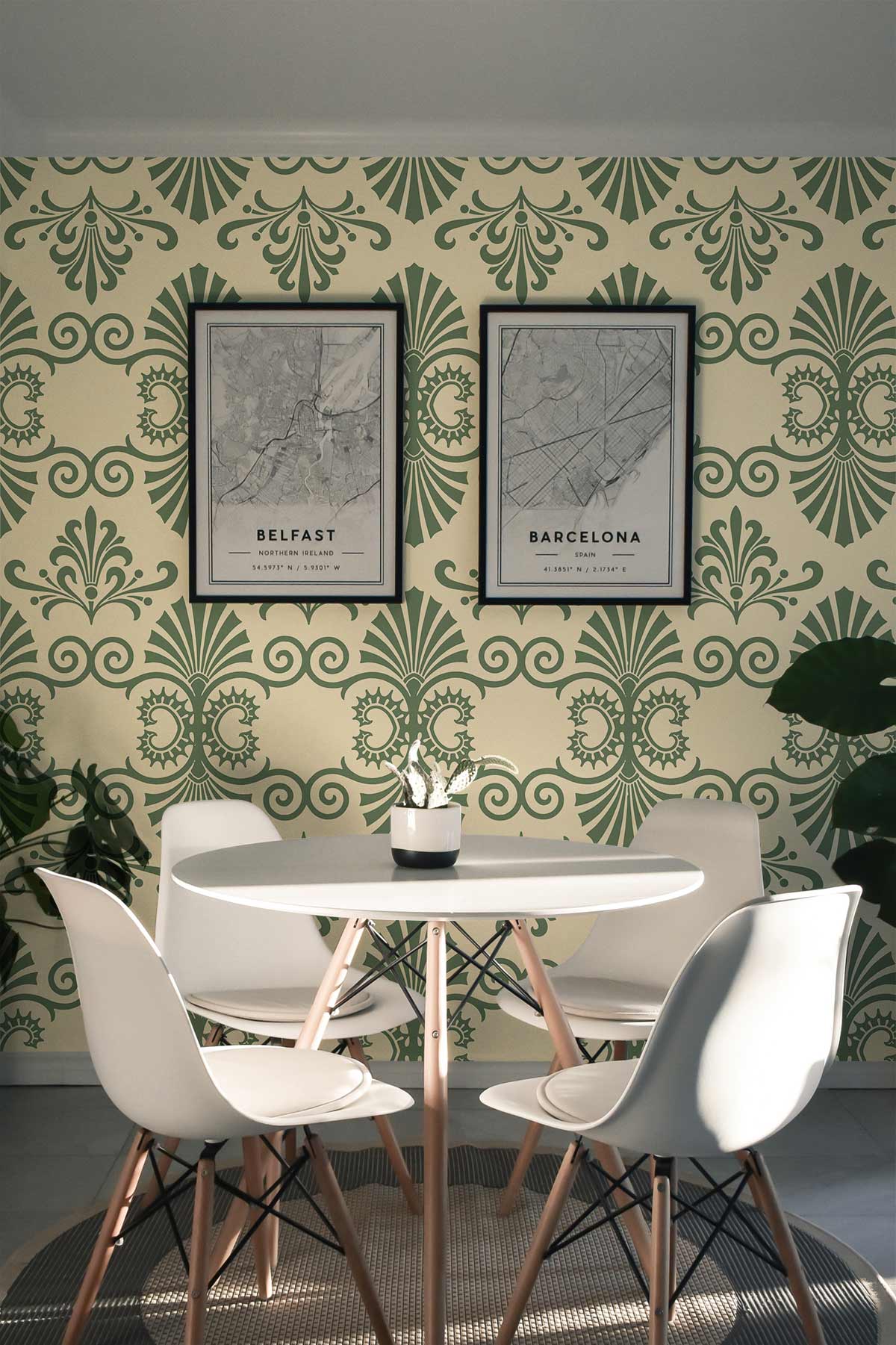 Discover a sophisticated elegance with the Ancient Greece Key Wallpaper Mural. This design features intricate patterns reminiscent of classical Greek motifs, blending symmetry with artistry. The warm beige backdrop paired with striking green accents crafts an ambience that speaks both of history and timeless design. Ideal for creating a refined atmosphere in any space.