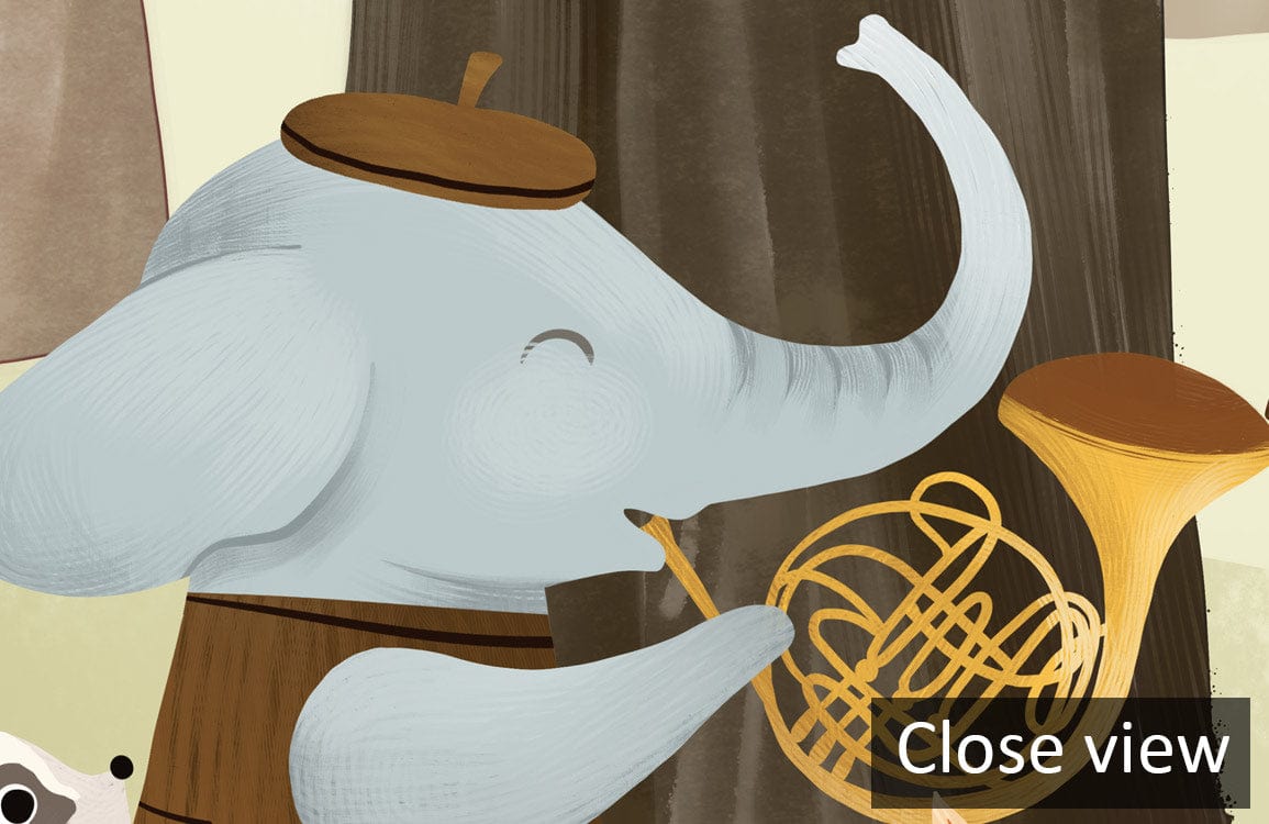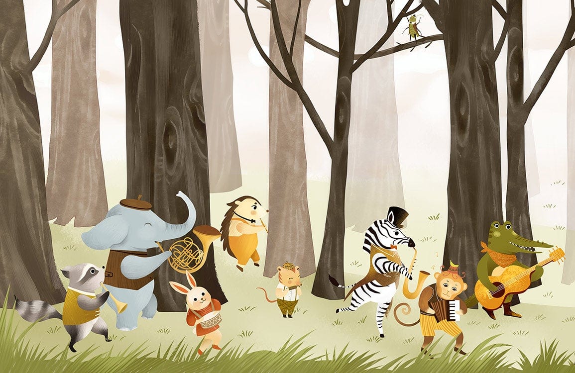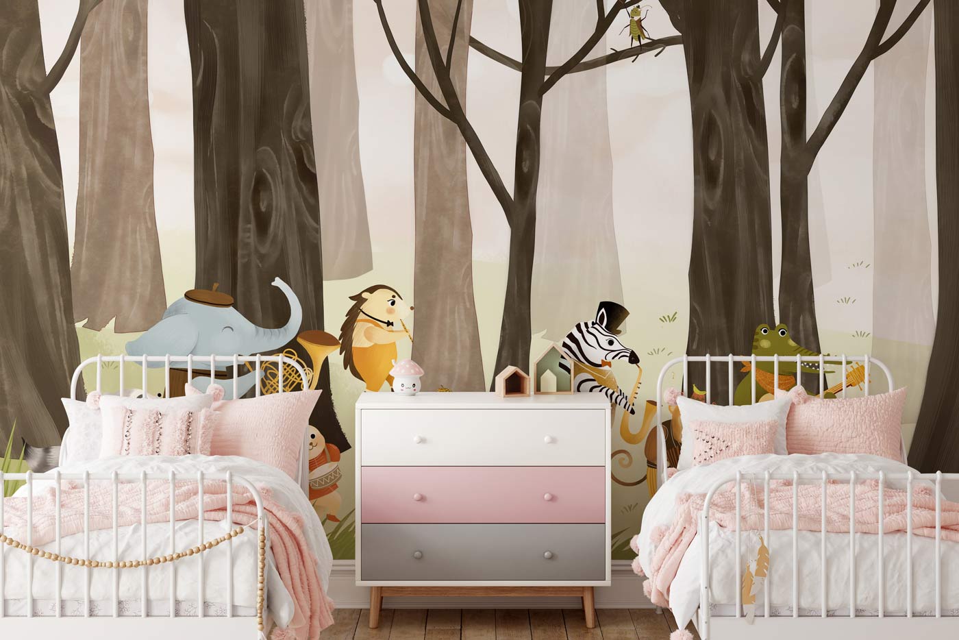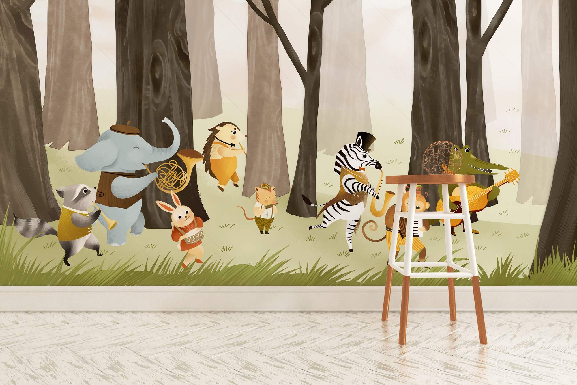 Enjoy a wonderful music concert in your home with this wallpaper mural. Featuring a cute animal band holding a concert in the forest, this adorable, attractive painting is heart-melting and will be perfect for your child's bedroom and playroom. Interesting rendering with a natural atmosphere and a refreshing wall decoration perfect for your kids.