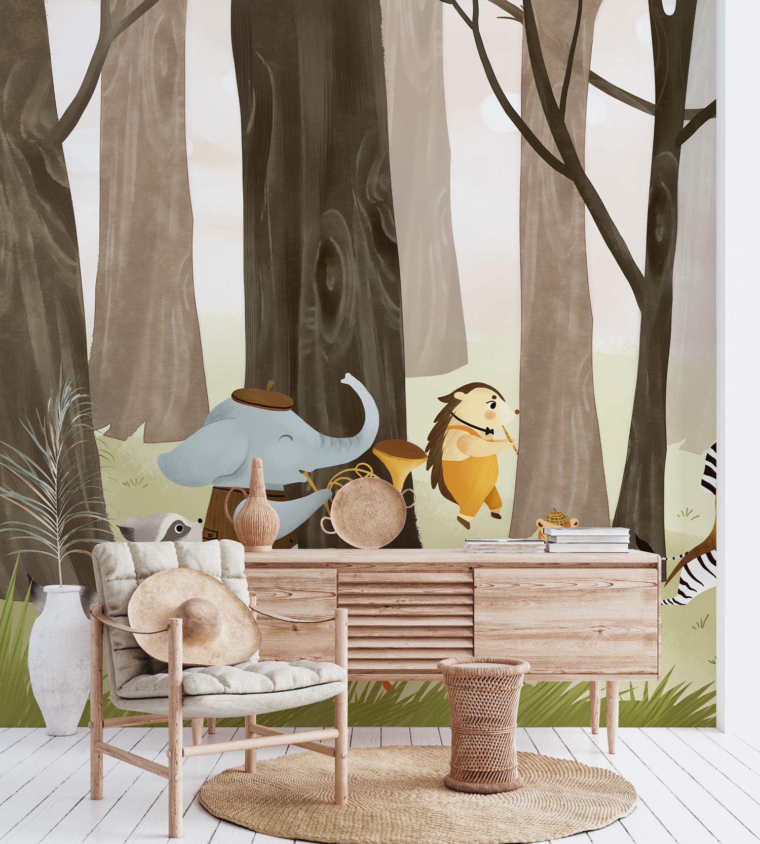 Immerse your space in whimsical charm with the Animal Band II Wallpaper Mural, where a delightful ensemble of animated creatures playfully graces an enchanting woodland scene. The hand-painted design captures intricate details and textures, infusing any room with an elegant yet playful ambience, making it an ideal choice for both contemporary and classic interiors.
