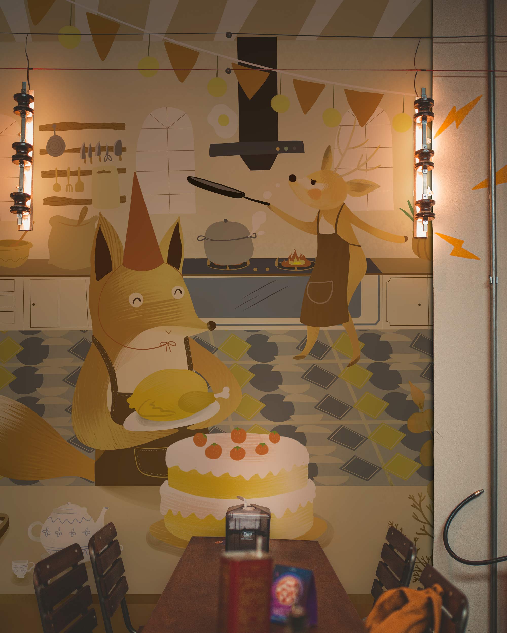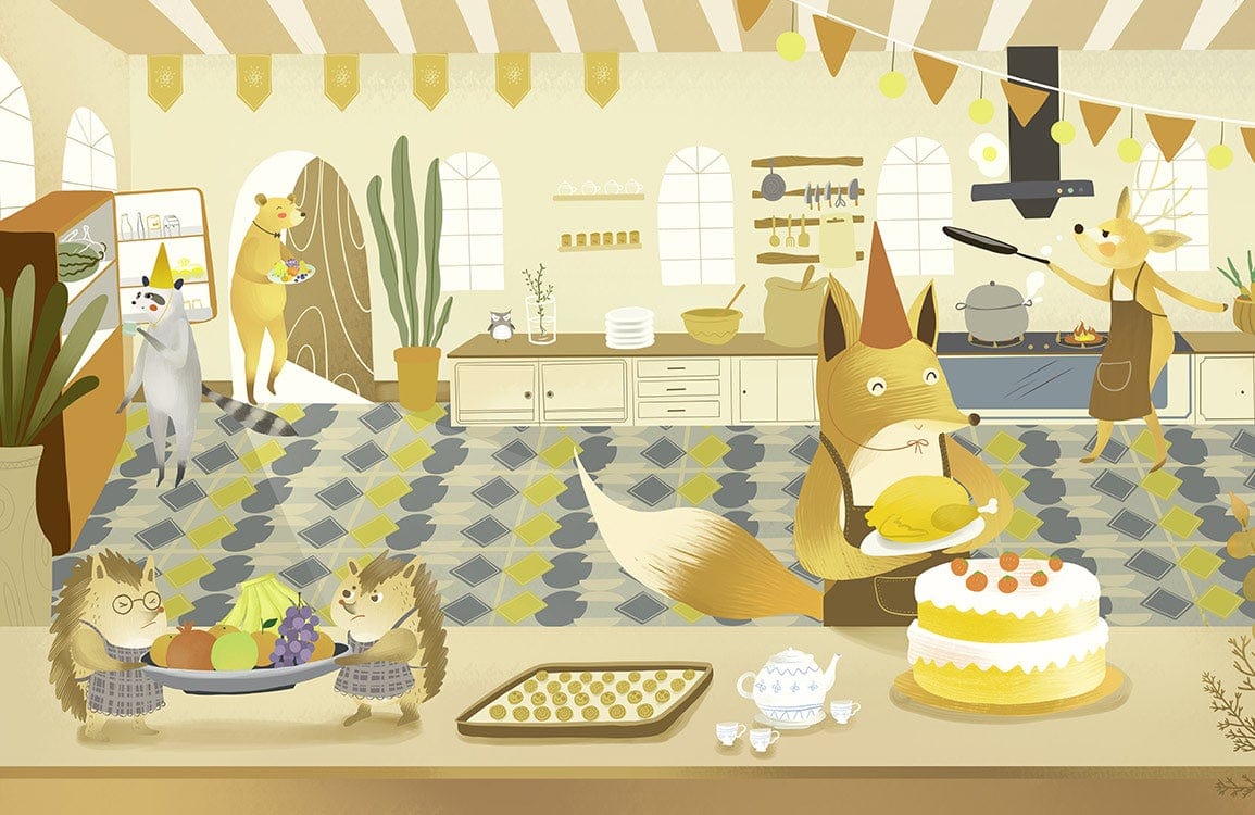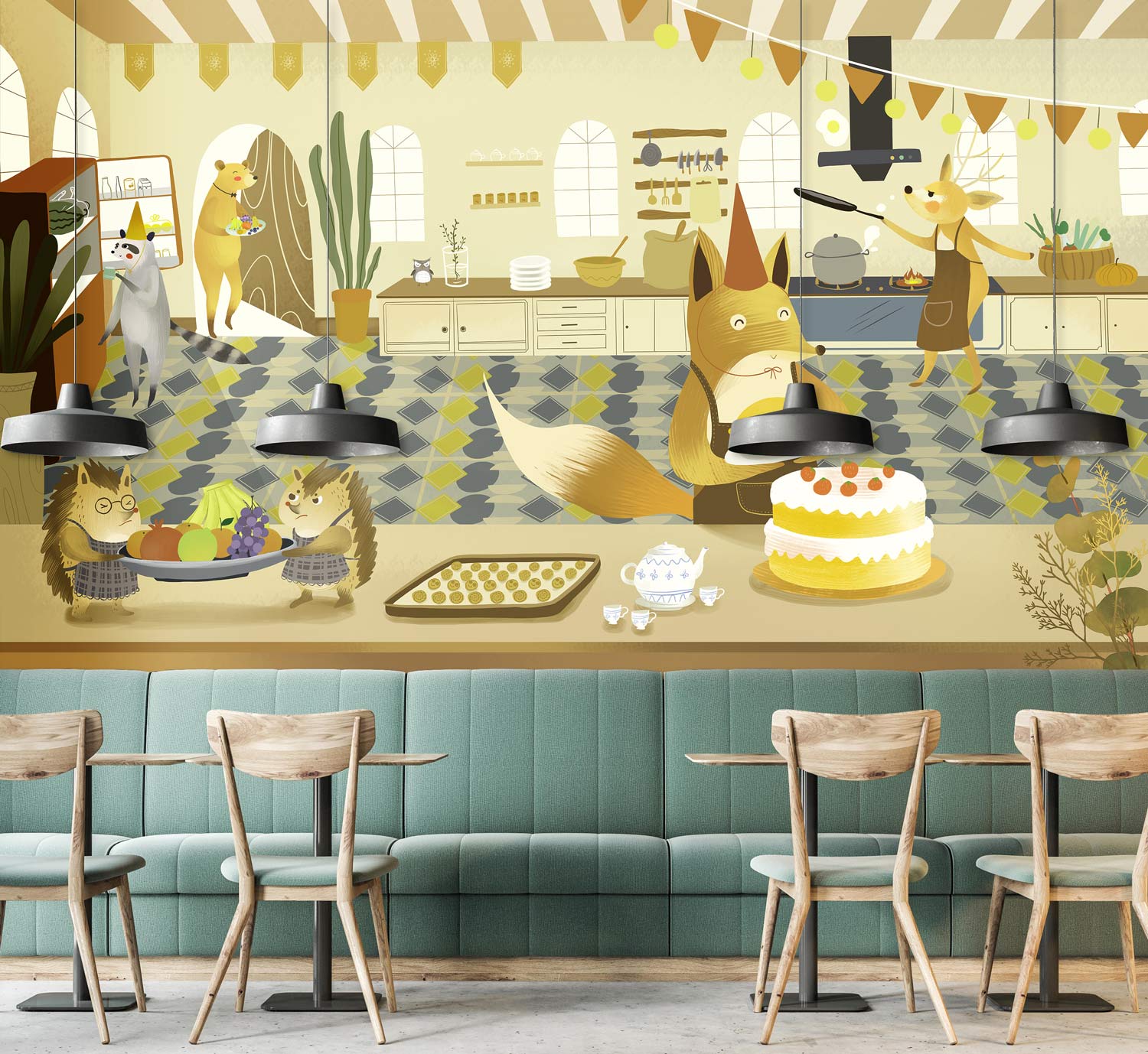 Your kids are going to love this wallpaper mural. Featuring a lot of cute animals cooking in the kitchen and preparing for the dinner, this adorable, attractive painting is heart-melting and will be perfect for your child's bedroom and playroom. Interesting rendering with a natural atmosphere and a refreshing wall decoration perfect for your kids.