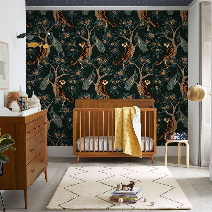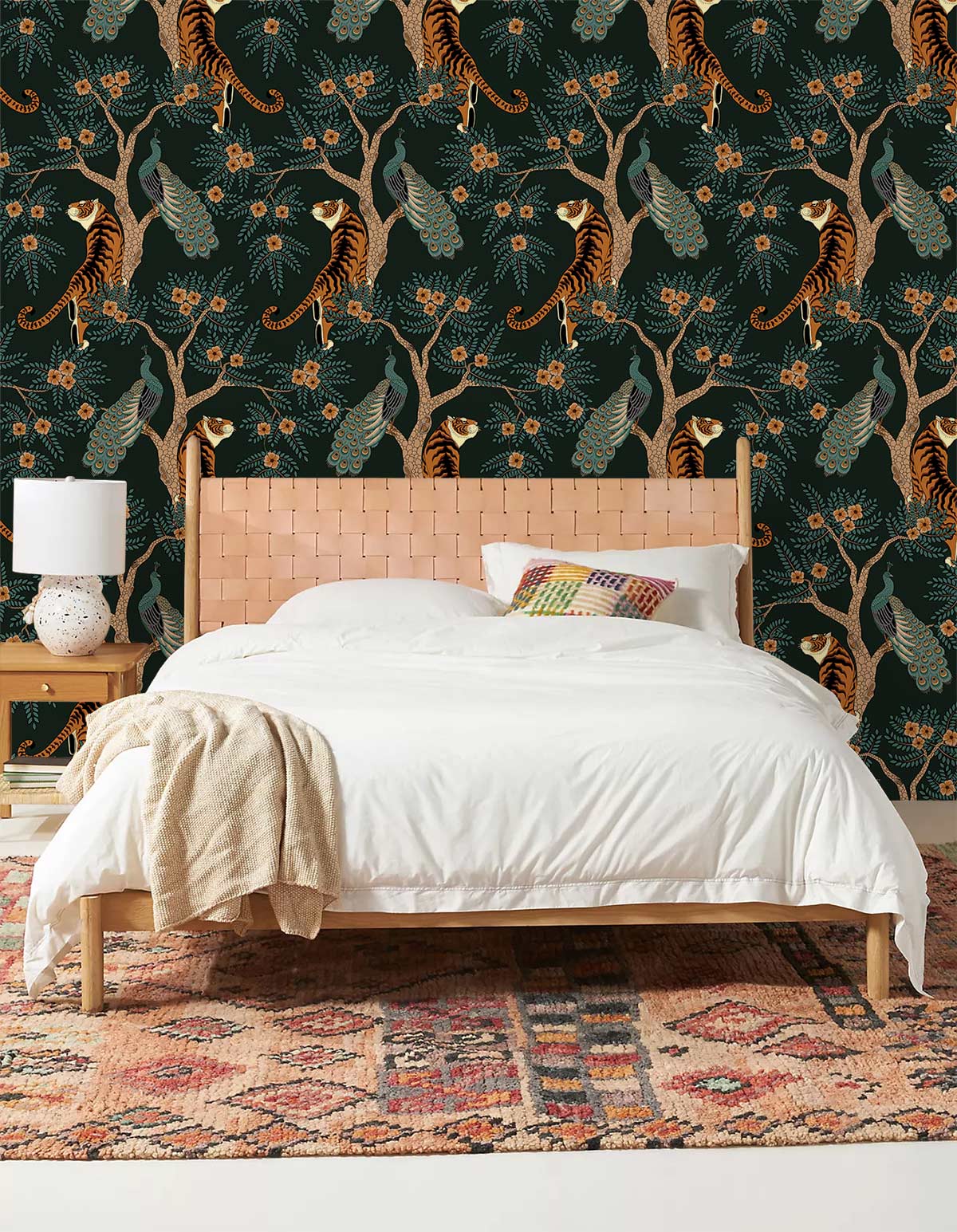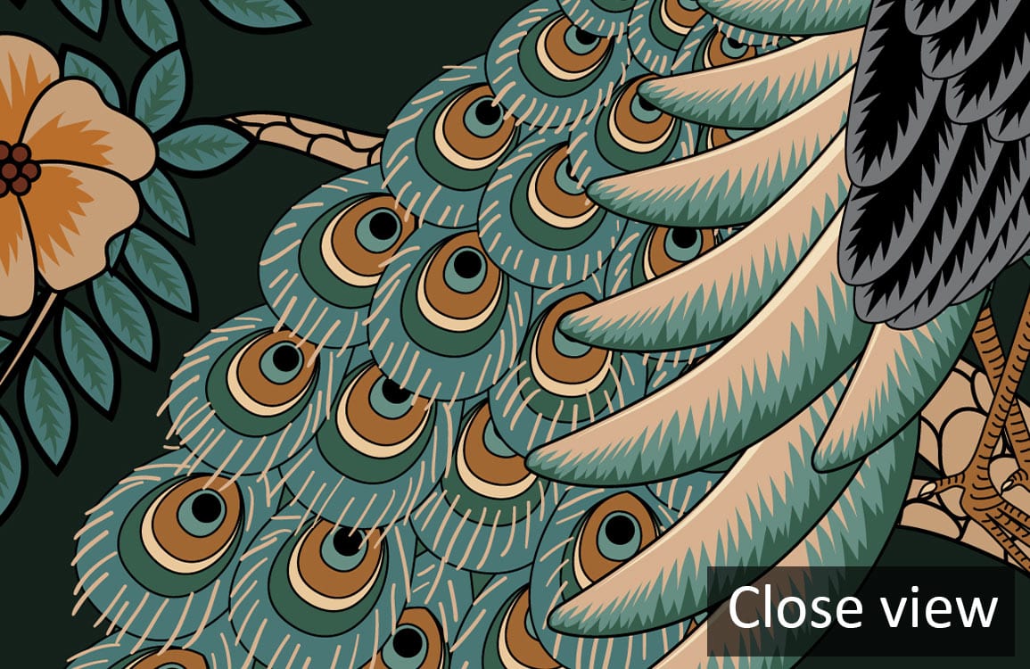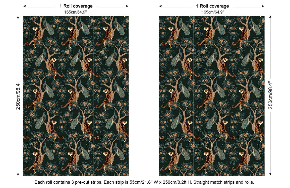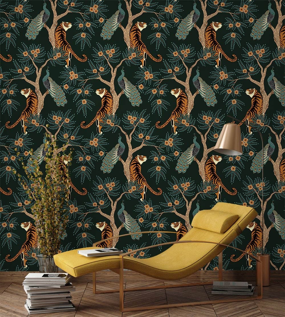 Immerse your space with the captivating 'Animal Leisure' wallpaper mural, showcasing a lush tapestry of peacocks and tigers gracefully intertwined among delicate, blossoming trees. This mural's rich jewel tones and intricate detailing create an ambience of tranquil sophistication, making it an exquisite addition to a variety of interior settings.