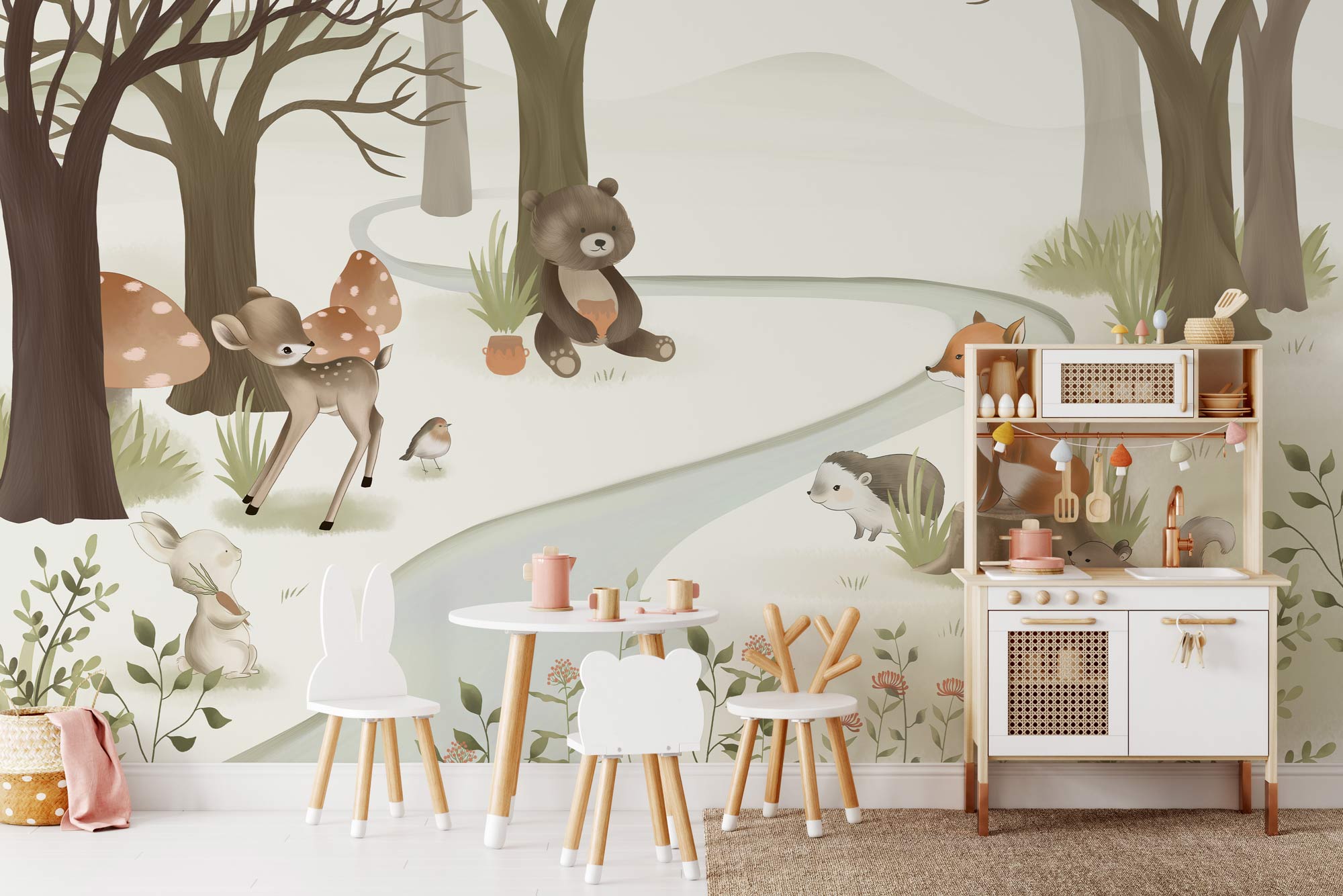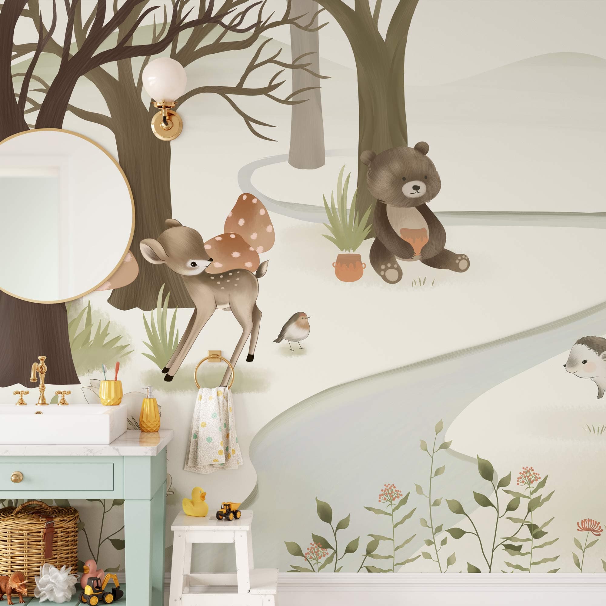 Easily bring a breathtaking forest animal theme to a children's bedroom or nursery with our water colour Fauna wallpaper, full of cute forest critters and natural colours. This mural is a hand-painted design featuring some of the adorable animals found in forests, such as bear, deer and fox. Little ones will be amazed with this wildlife scene as a feature wall in their room. Bring out the curious side of your kids with a nature-filled wall design that they隆炉ll cherish while they grow.