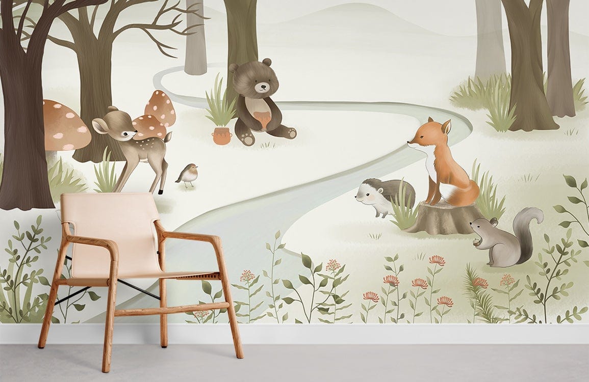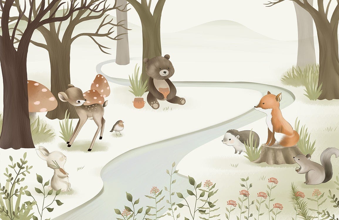 Step into an enchanting woodland gathering with the Animal Meeting Wallpaper Mural. Its delicate rendering of forest creatures, nestled among gentle foliage, evokes a serene nursery or peaceful study sanctuary. The refined palette of soft greens and warm earth tones brings a harmonious and inviting presence to any space.