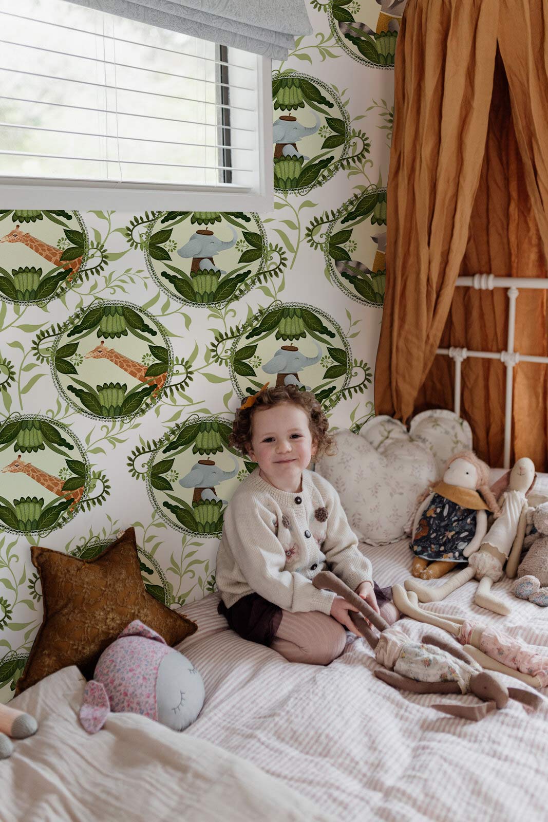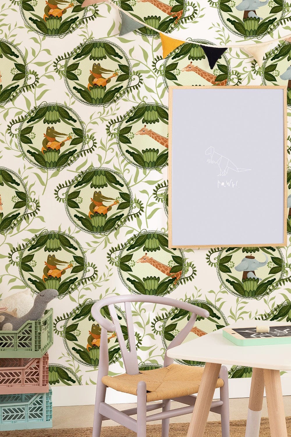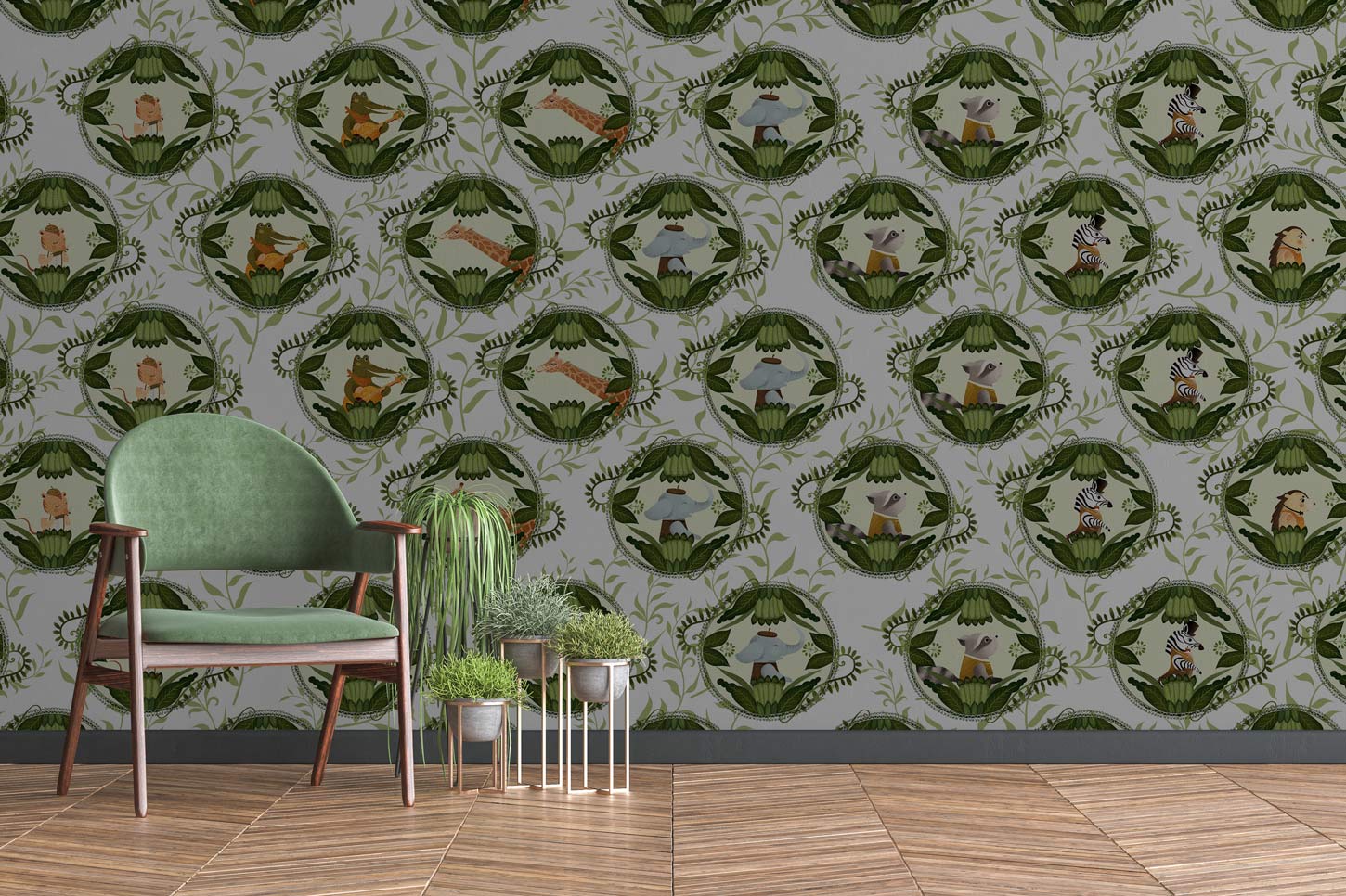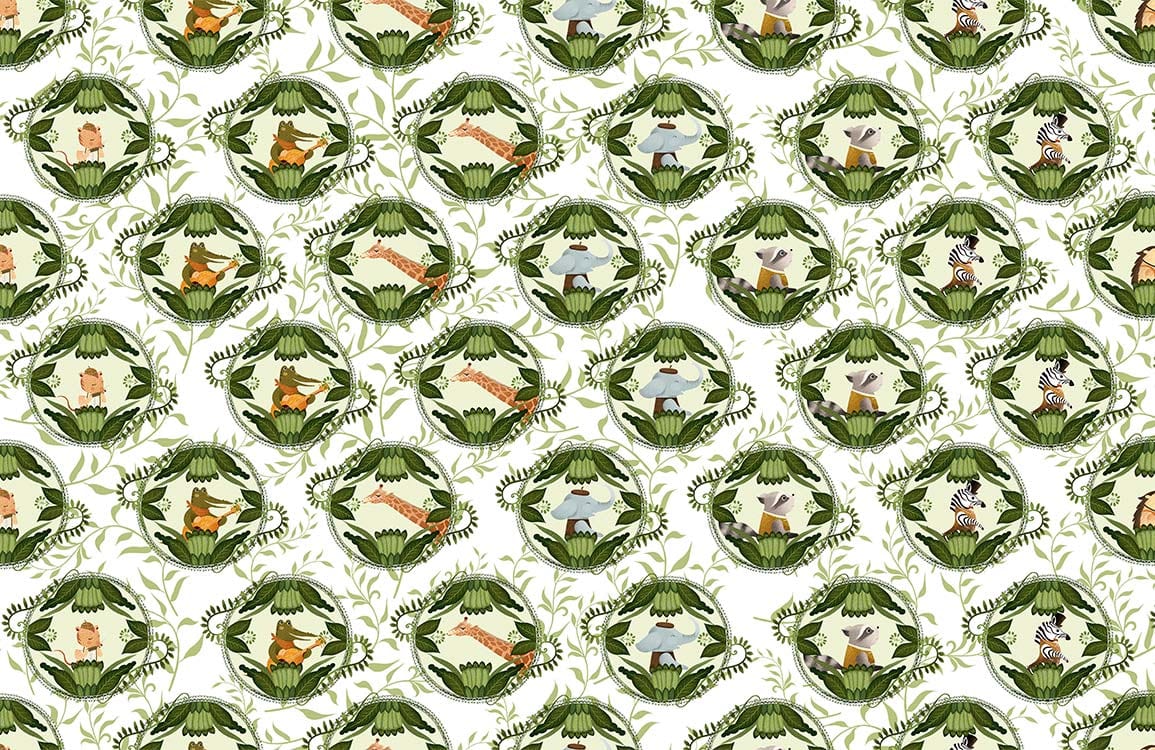 If you are looking for a cute animal wallpaper mural that can fit your interior space and art decorations, then this animal musician wallpaper mural is your perfect choice. This wall covering designed with cute animal musicians in repeated pattern of green leaves frame will bring your space a sylish and eye-catching look.