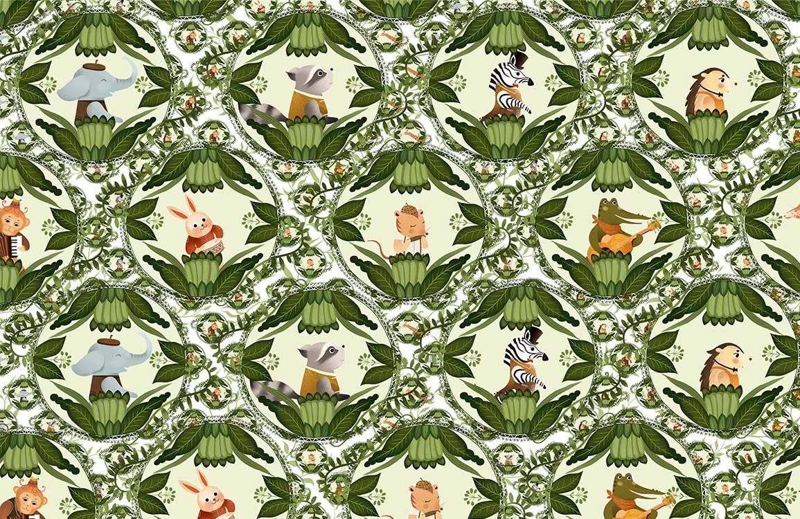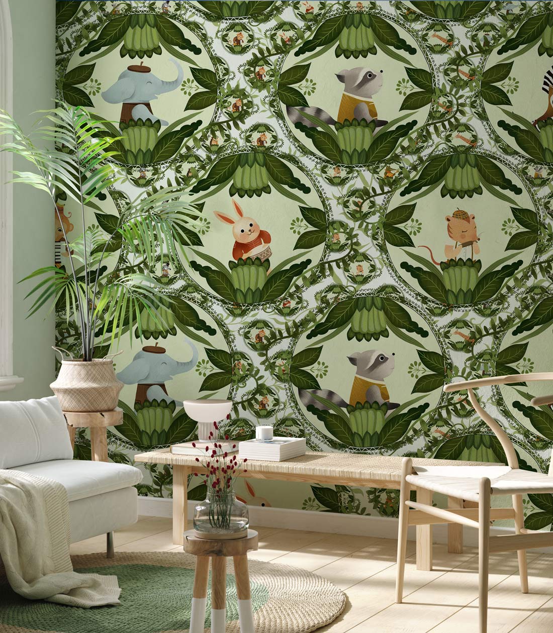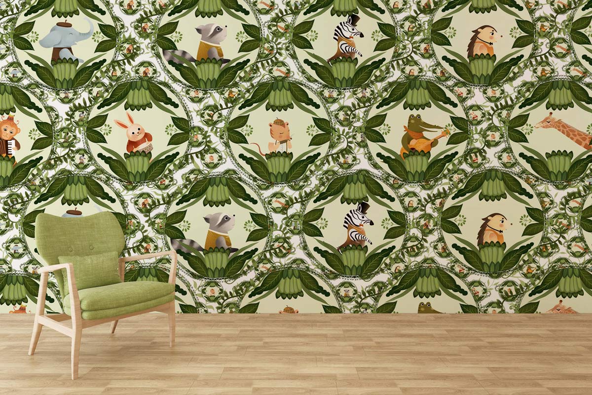 If you are looking for a cute animal wallpaper mural that can fit your interior space and art decorations, then this animal musician wallpaper mural is your perfect choice. This wall covering designed with cute animal musicians in repeated pattern of green leaves frame will bring your space a sylish and eye-catching look.