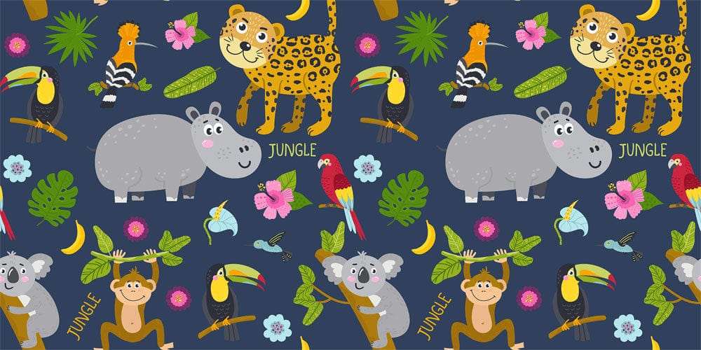 Immerse any space in the whimsical charm of the Animal Party Wallpaper Mural. Its playful design features a lively ensemble of jungle creatures set against a deep navy backdrop, bringing the vibrancy of the wild indoors. This mural blends artistry with sophistication, making it a delightful choice to infuse energy and elegance across different settings.