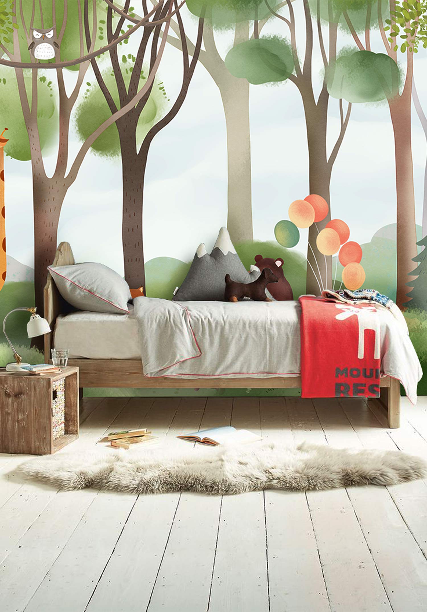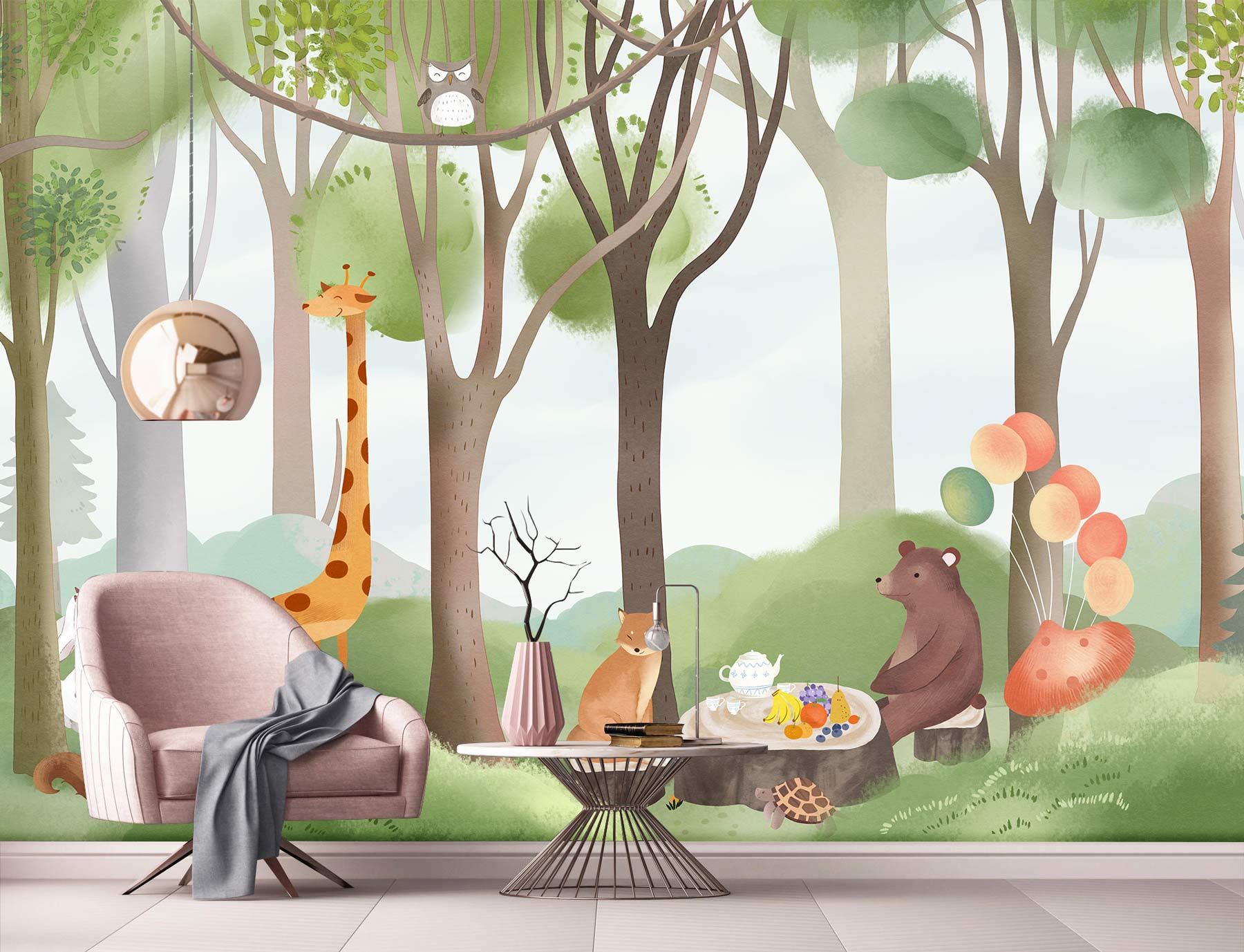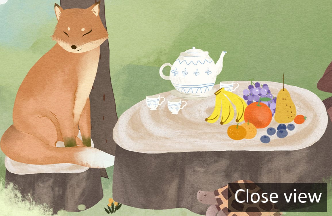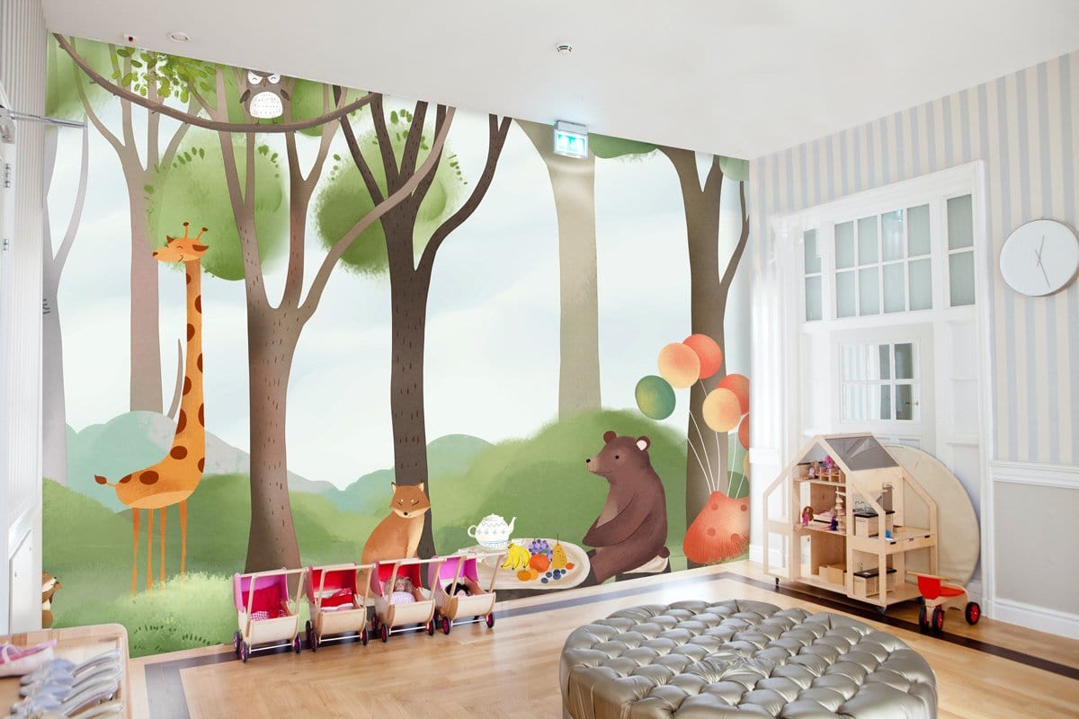 If you are looking for a cute forest wallpaper mural for your kid's room, here is a great one for you. This beautiful painting of animals having a wonderful picnic in the peaceful green forest designed in soft pastal tones will be perfect for your child's bedroom and playroom. Interesting rendering with a natural atmosphere and a refreshing wall decoration perfect for your kids.