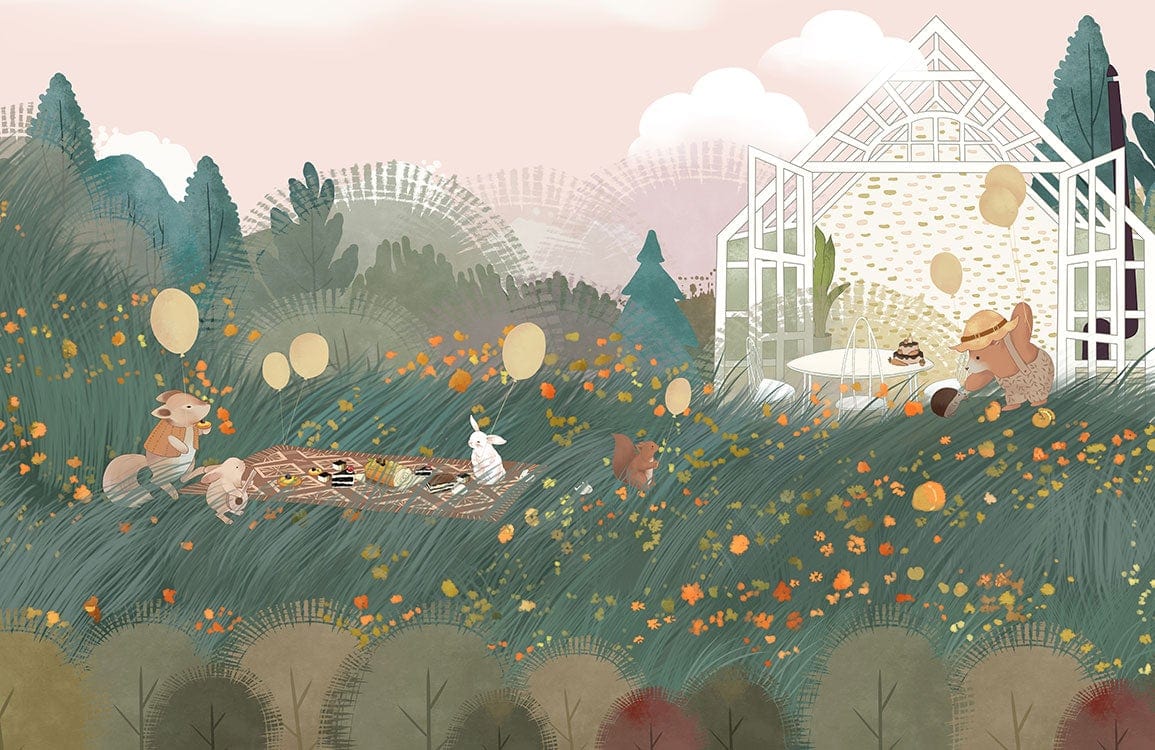 Immerse your spaces in whimsical charm with the Animal Picnic Wallpaper Mural. This captivating design features a serene pastoral scene, where charming animals gather for a picnic amidst a lush green meadow. Bathed in gentle hues, with a backdrop of a quaint glasshouse basking in soft sunlight, it brings an enchanting touch of nature indoors. Designed with intricate details, its sophisticated aesthetic complements both classic and contemporary interior themes effortlessly.
