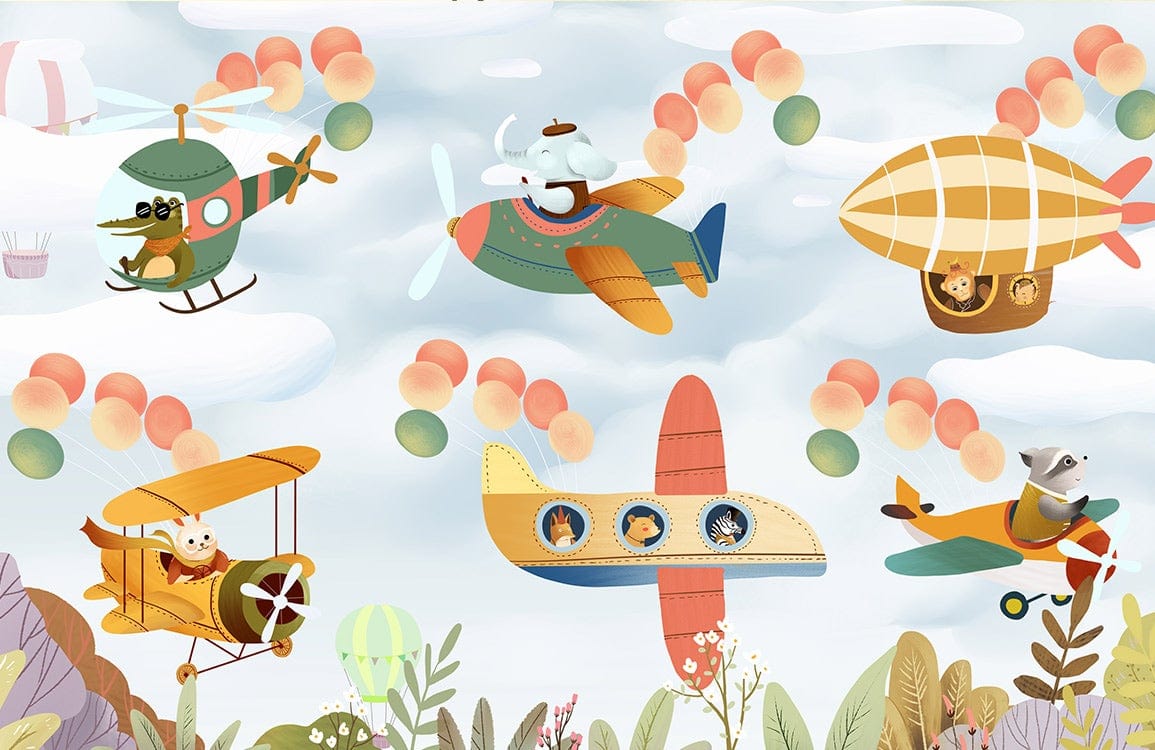 Immerse your space in whimsical charm with the Animal Pilots Wallpaper Mural, featuring a delightful array of aviator animals and vintage aircraft. The playful design, highlighted by intricate depictions of varied flying machines, offers a sophisticated yet spirited aesthetic. Gently painted with delicate strokes, it adds a touch of artistic flair to any setting, making it perfect for both children's rooms and creative adult spaces.