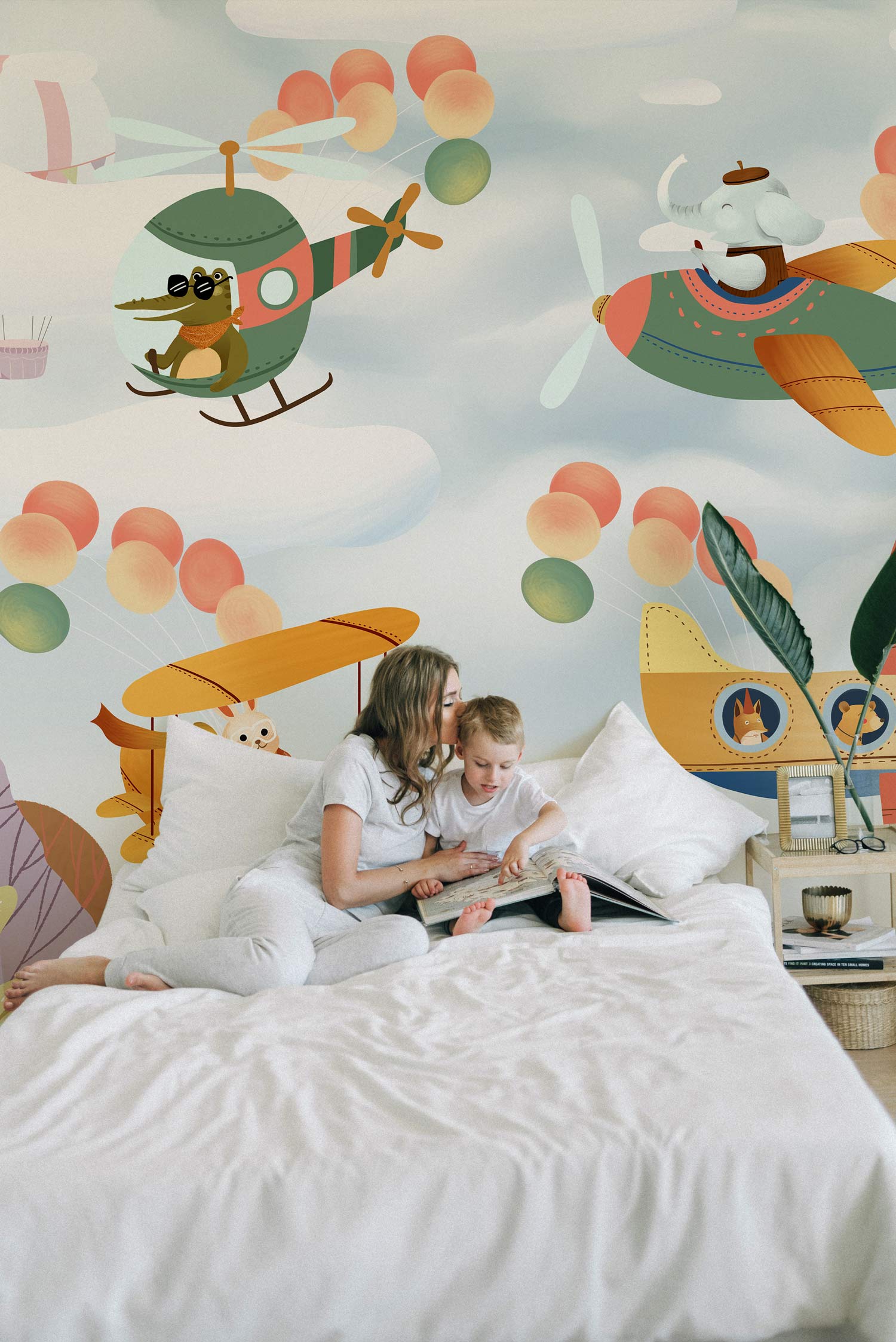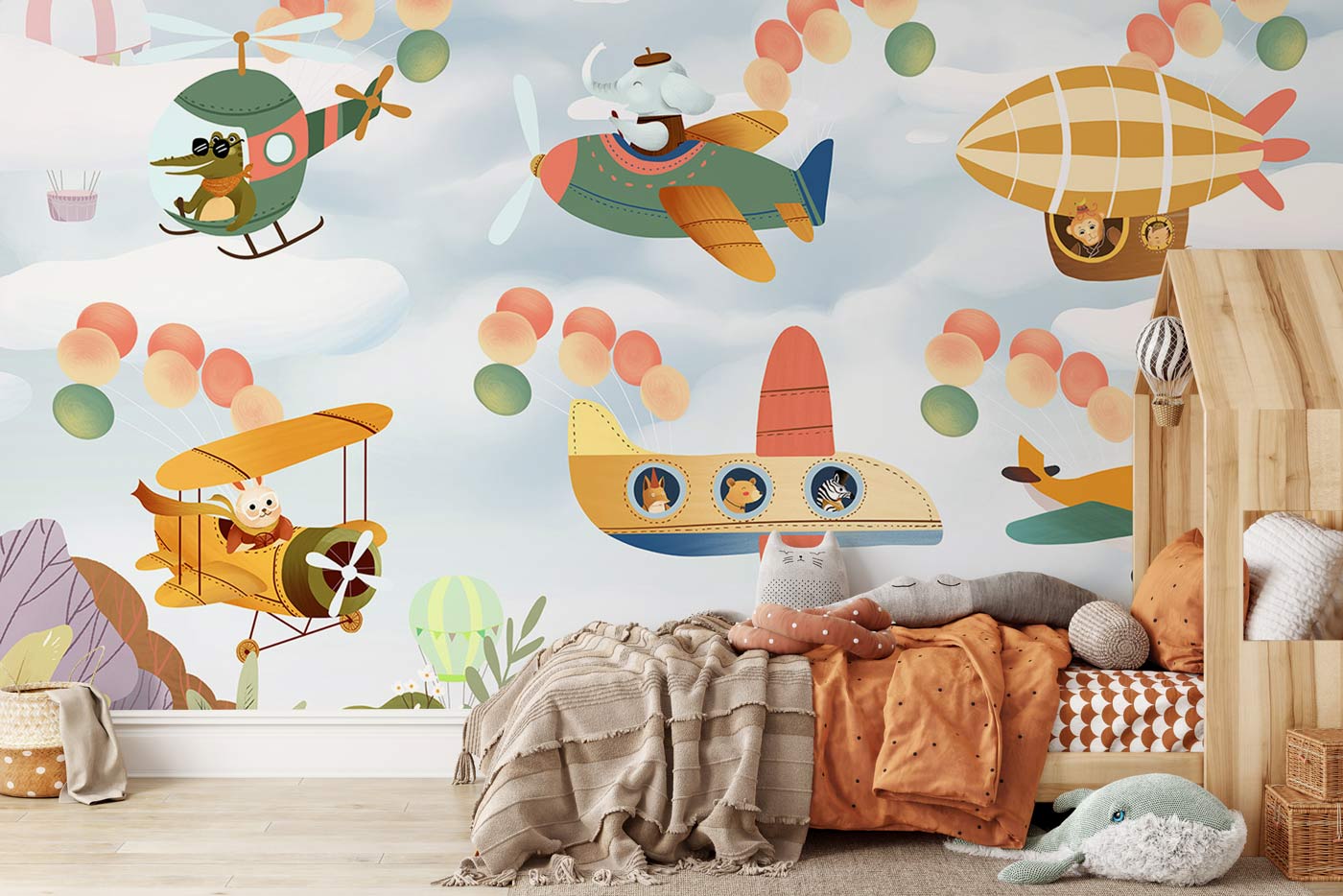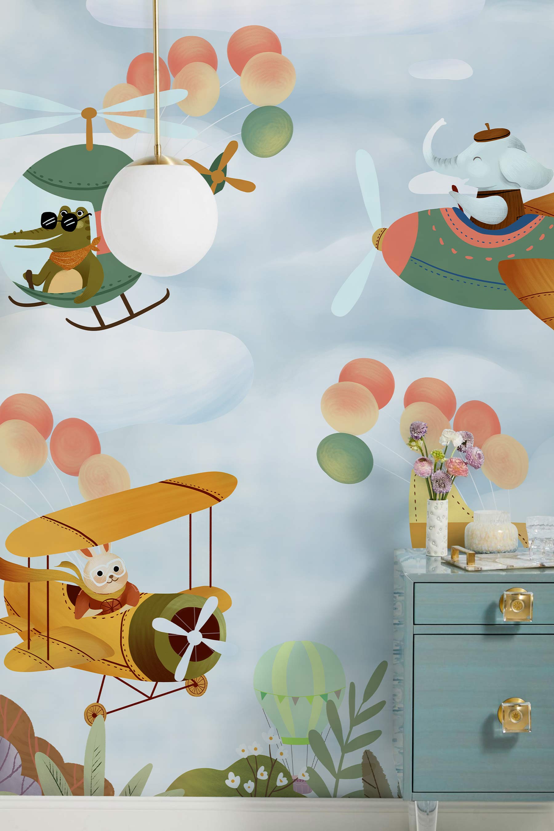 Travel in the sky for fun with this adorable animal pilots wallpaper mural. This wallpaper design will take any kids room or nursery from plain to exciting with its playful design and fun, modern features. Match the wallpaper adorable tones by styling your children's space with lots of warm and soft colours, and keep things simple with a minimal mix of neutral and white decor.