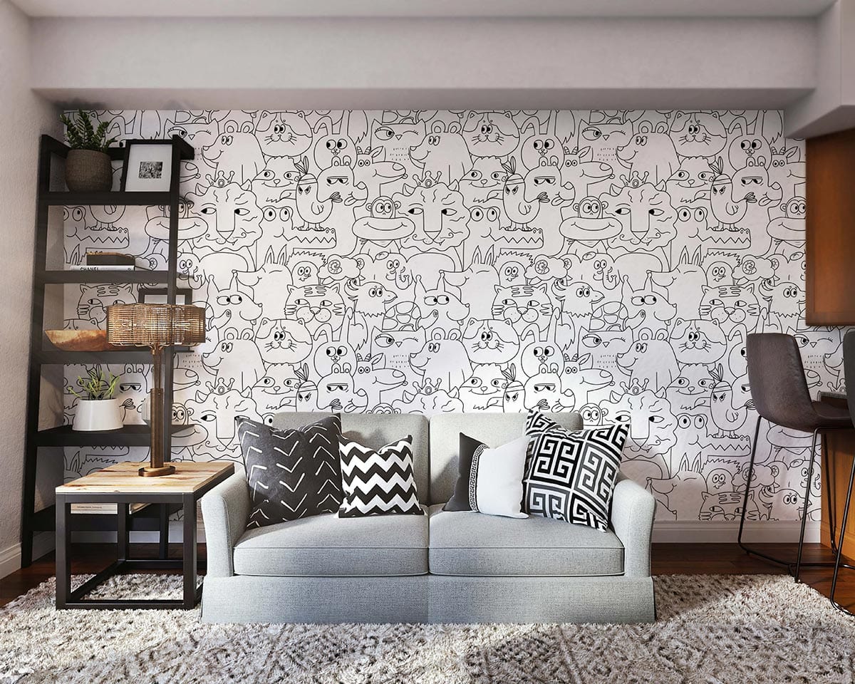 Our Animal Stick Figures Wallpaper Mural is a fun and unique way to add some colour and character to your home. Full of animals from all over the world, this nursery wallpaper mural will lighten up your home interior, no matter the style. The crowd of the varied animal sketch in white, black, and shades of grey create a sophisticated backdrop for your kids' spaces, so you can easily celebrate your love for animals with this animals wallpaper mural!