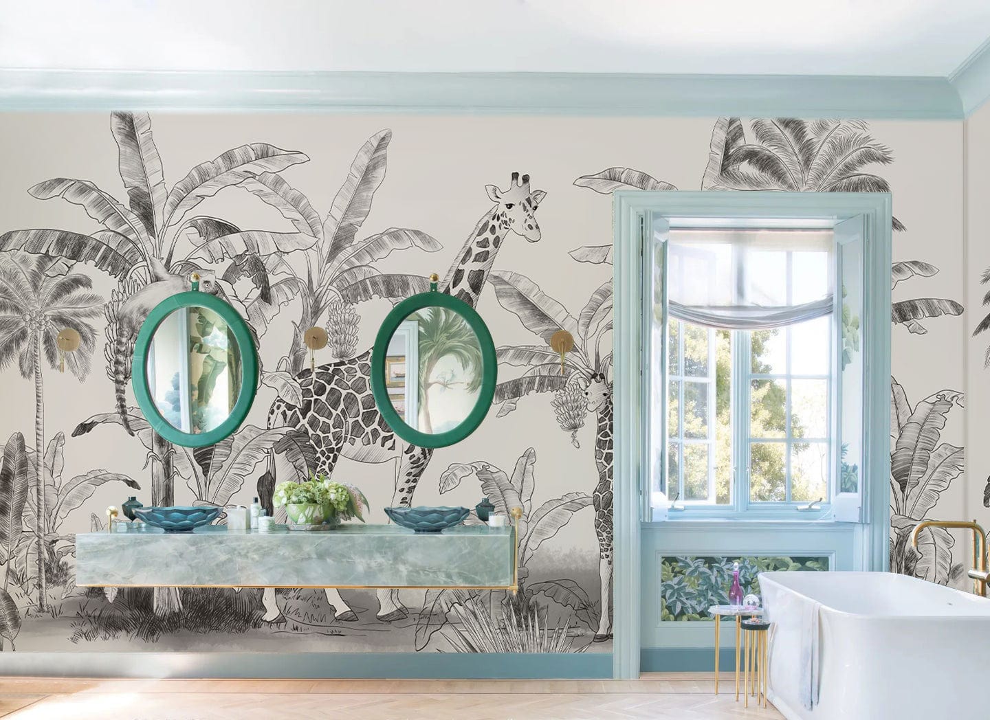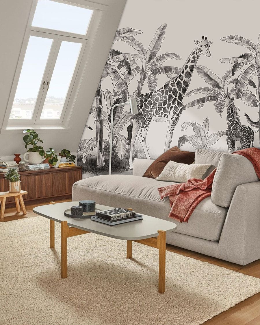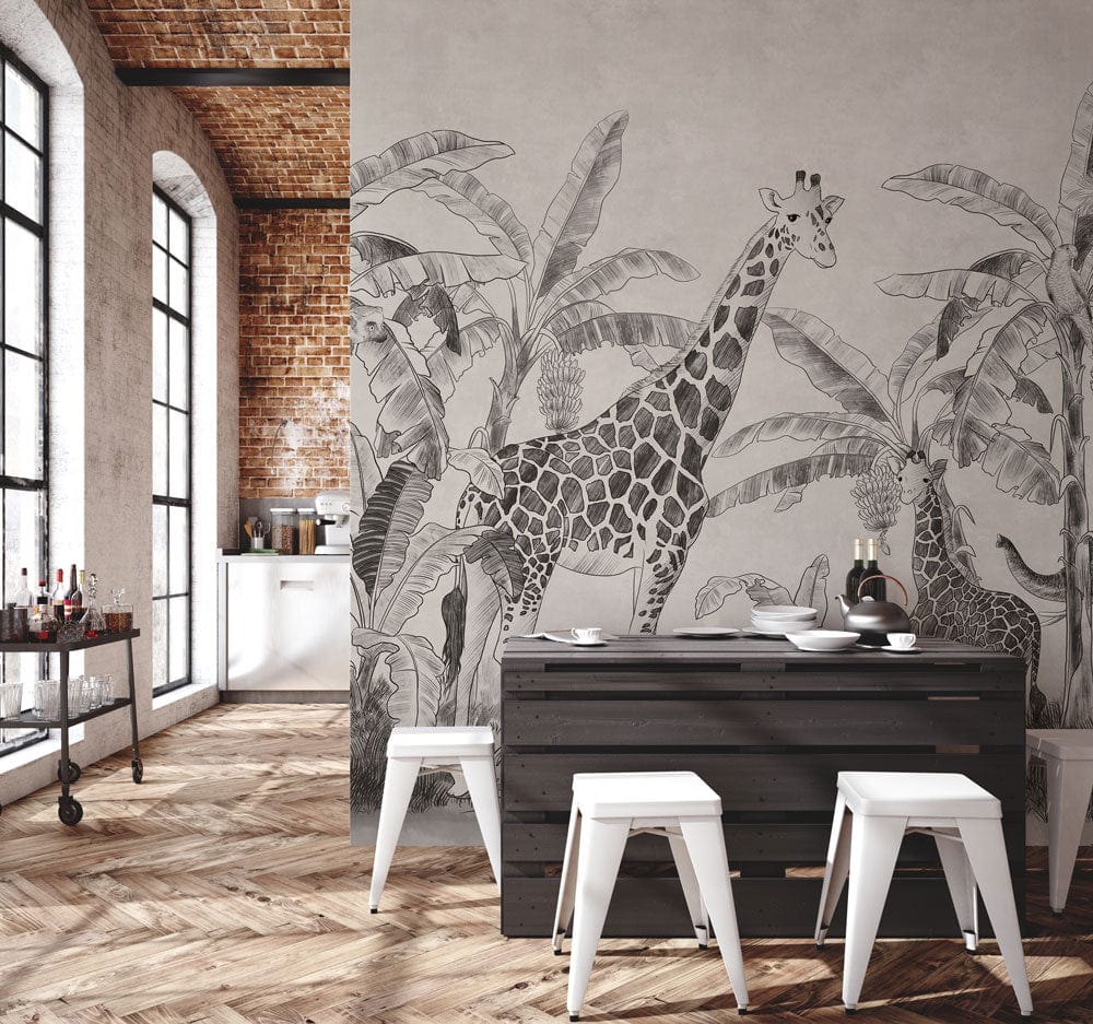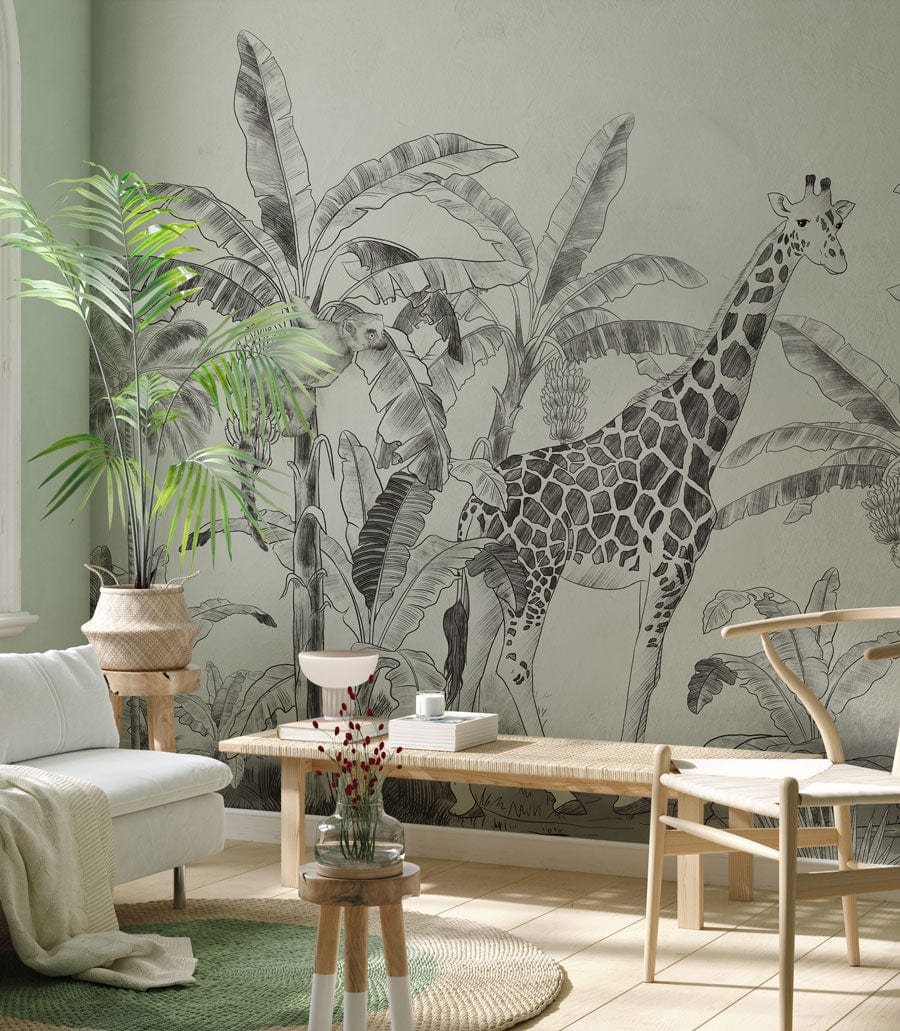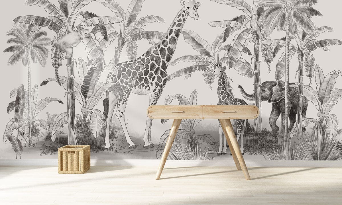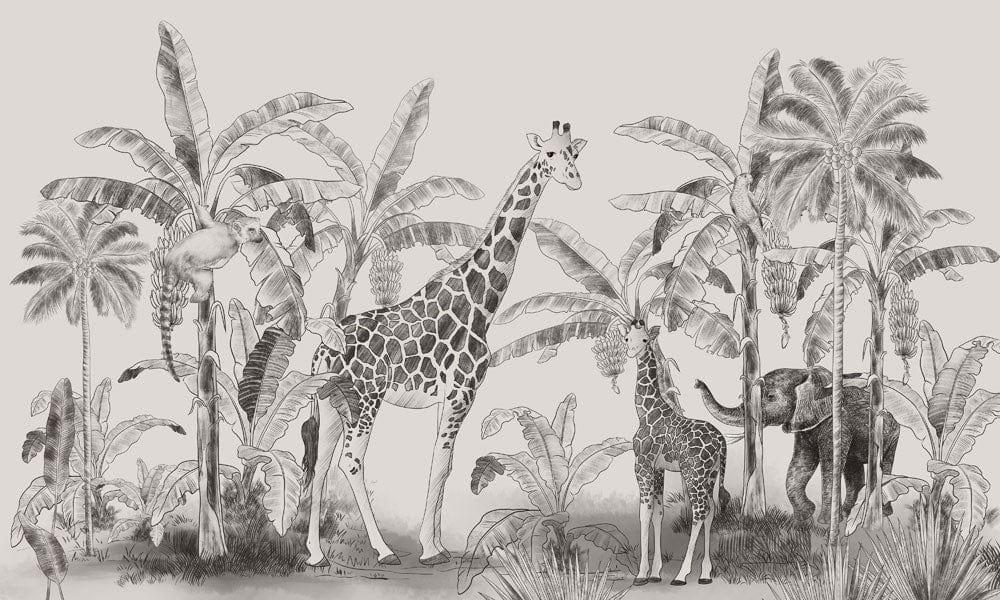 The Animals in Tropic Sketch Wallpaper Mural introduces a captivating scene of elegant wildlife amid lush tropical foliage. This sophisticated black and white design invites a timeless charm into your space, bringing an artistic touch that harmonises with any interior. Rich in texture and detail, each element from the graceful giraffes to the stately elephants, is intricately sketched, creating an ambience that is both serene and invigorating.