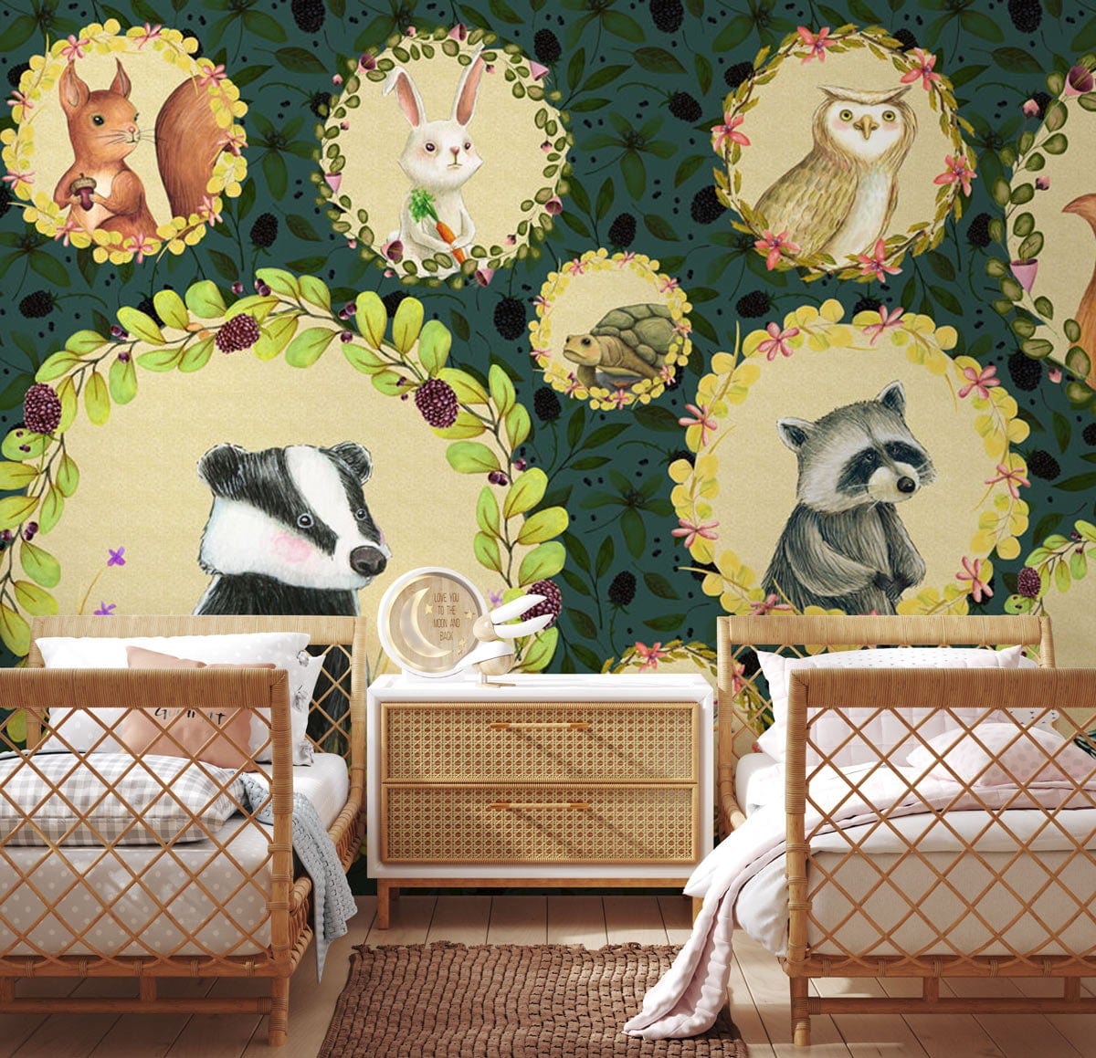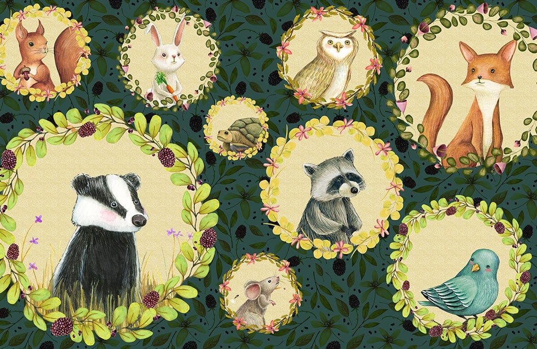 Immerse your space in whimsy with this Animals Portraits Wallpaper Mural. Majestic woodland creatures, delicately framed by floral garlands, stand against a rich, leafy background, creating a serene and sophisticated ambience. Each portrait is artfully rendered with exquisite detail, inviting a sense of wonder and harmonious elegance into any room.