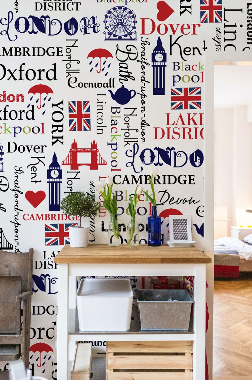 The Around London Wallpaper Mural serves as a vibrant tapestry of British heritage, weaving together iconic landmarks and typography in a playful, yet sophisticated arrangement. Rich in detail, this mural offers a striking visual conversation piece, ideal for personal libraries, modern living spaces, and eclectic offices. Every glance reveals a new element of the United Kingdom's illustrious cityscape.