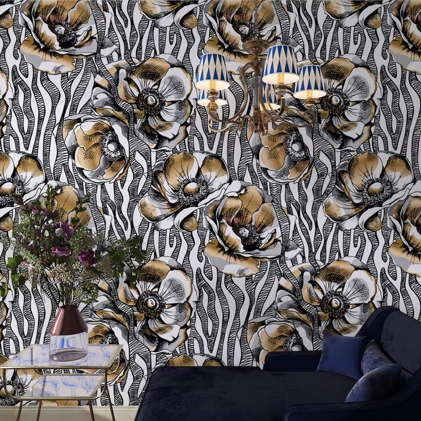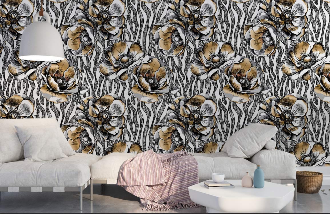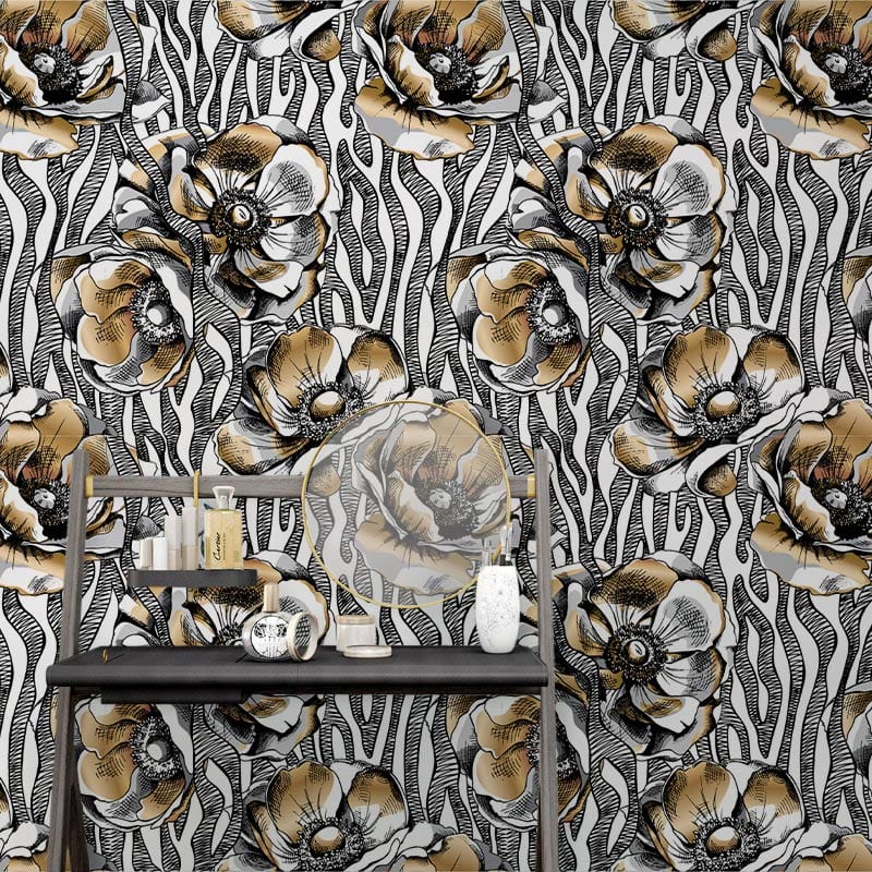 Immerse your space in artistic luxury with our Gold and Black Floral Mural Wallpaper. The intricate floral patterns intertwine with bold lines, creating a striking symphony of gold and black. This mural's exquisite detailing and rich textures lend an air of sophistication, making it a versatile choice for both classic and contemporary interiors.