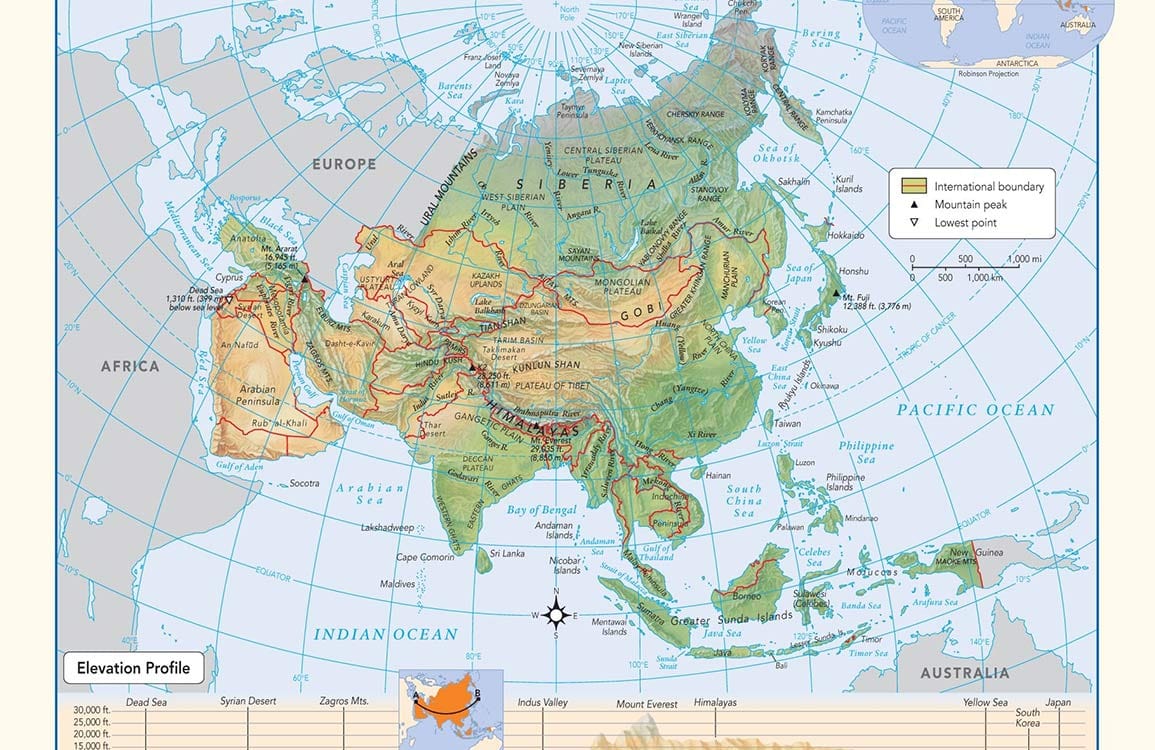 The Asia Physical Wallpaper Mural captures the continent's breathtaking terrain with remarkable precision. Its intricately detailed design maps mountains and rivers, accentuating natural wonders in serene hues. Ideal for creating a sophisticated and worldly ambience, this mural is a testament to meticulous artistry and design, perfect for any setting seeking a cultural touch.