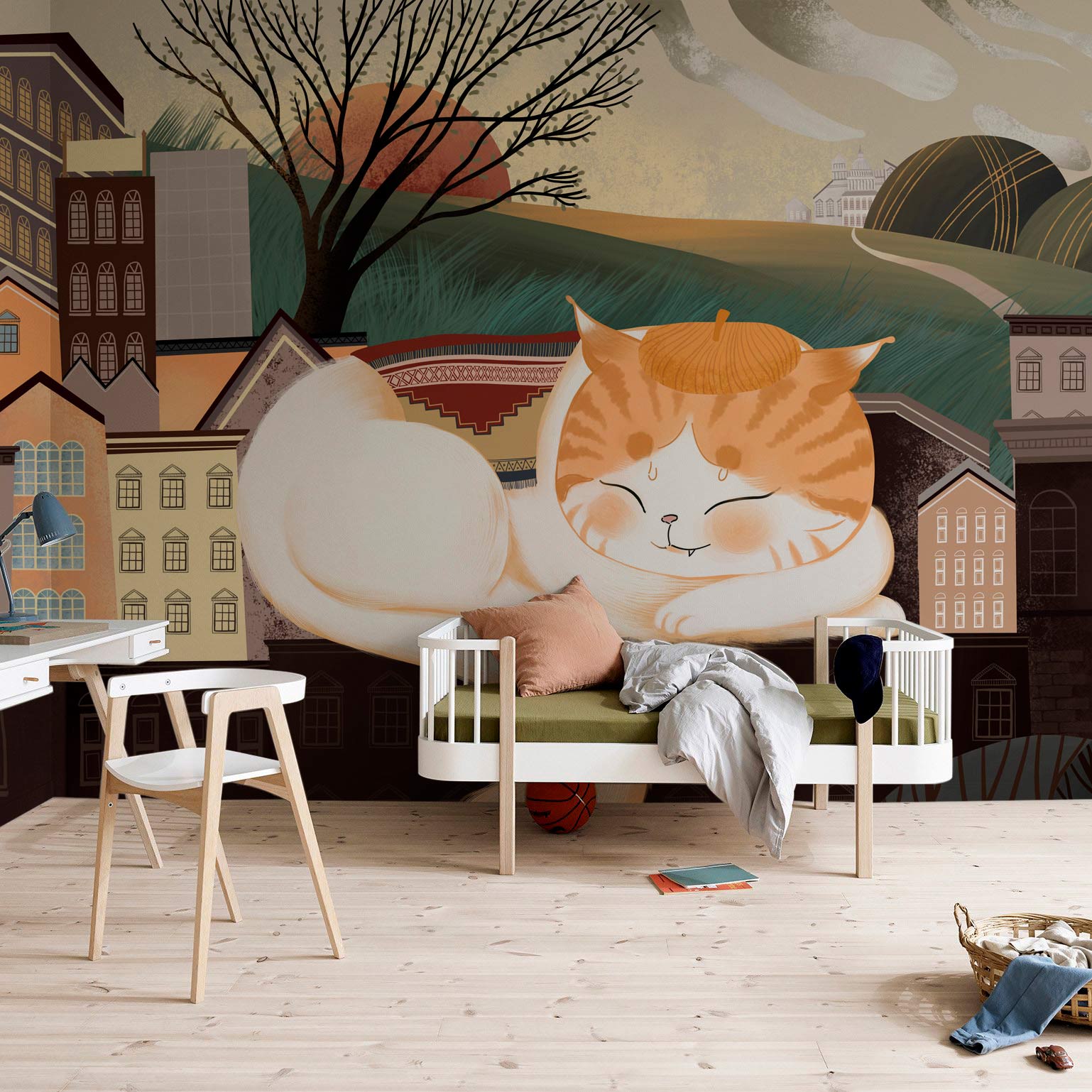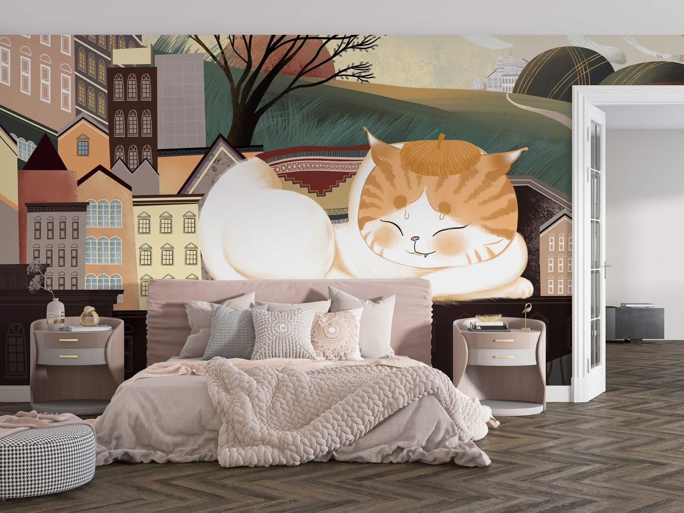 Take a look at this cute cartoon cat taking a nap. Painted with colouful colours that will be perfect for your child隆炉s bedroom or playroom. Place this adorable cat wallpaper on the wall that is next to their bed and enjoy the colourful and lively feeling it brings to you.