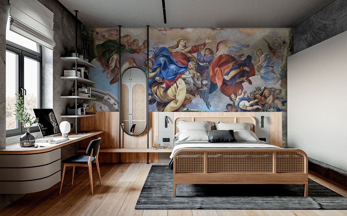 Embrace your home with this master piece of the angelic assumption of Mary. This wallpaper mural that will add spiritual themes to your place and give blessings vibes to the house. This mural with these finest details will take the place to a different level of elegancy. You can use it in your office, or at your living room or at any place that needs a special taste and vibe. Let everyone gets amazed by your taste and how elegant you are! This design is full of colours and details so you need to style it with classic simple decorations and antique for a full perfect view.