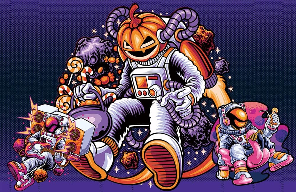 Welcome to the world of space trave! This Astronaut Bang Wallpaper Mural features a design with scary astronauts perfect for Halloween. Depicting an astronaut with a gun and pumpkin head, with other details like space rockets and boom speakers, this mural also makes a great gift idea for kids, boys, or girls who love outer space! The format will make your wall come to life and will be a must-have wallpaper for any fan of space, astronauts, and the scary side of life! Optimized for high-definition printing, it's a great way to decorate your room!