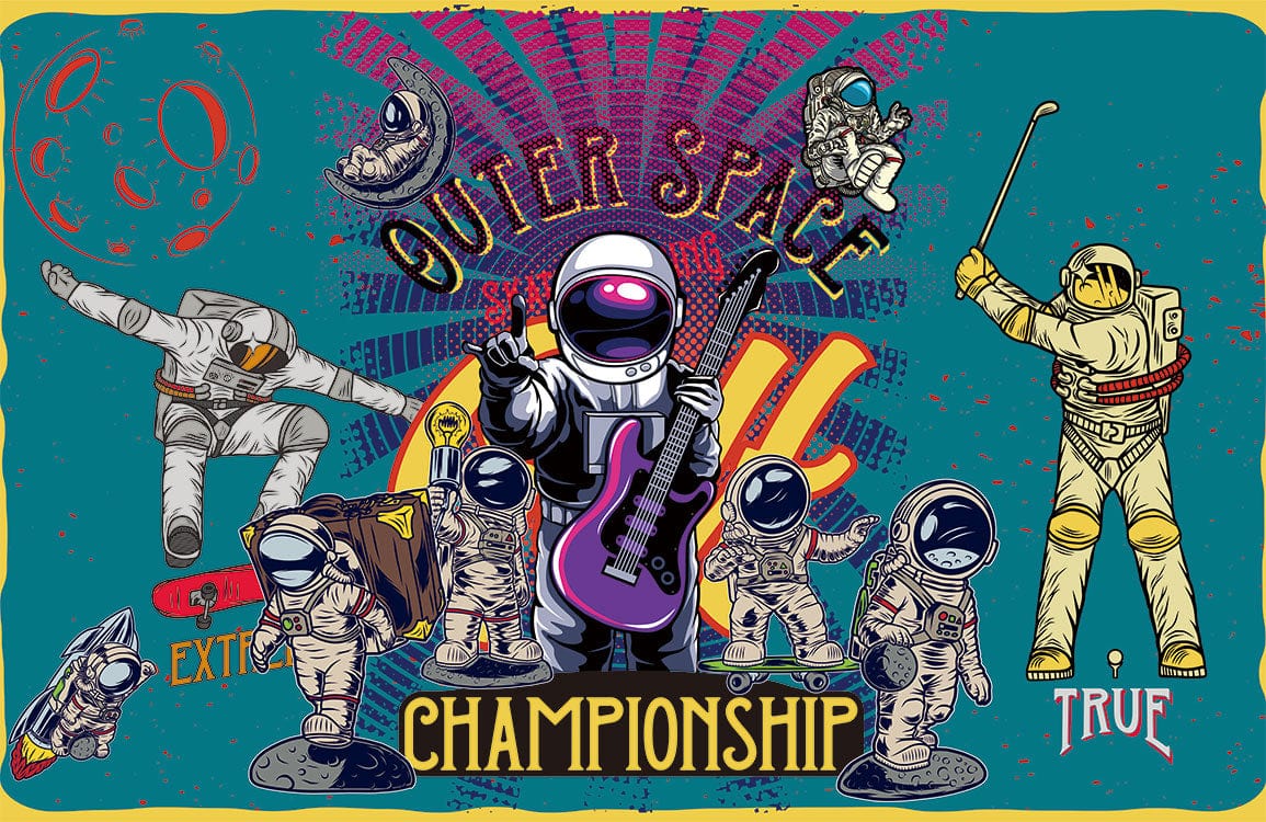 Immerse yourself in a cosmic narrative with the Astronaut Career Wallpaper Mural. This captivating design features astronauts in various playful poses, each character exuding charm and vibrancy against a rich, teal backdrop. Perfectly capturing the thrill of space adventure, it integrates intricate artistic details and a retro flair, making it a stunning focal point that elevates any room with a sense of wonder and imagination.
