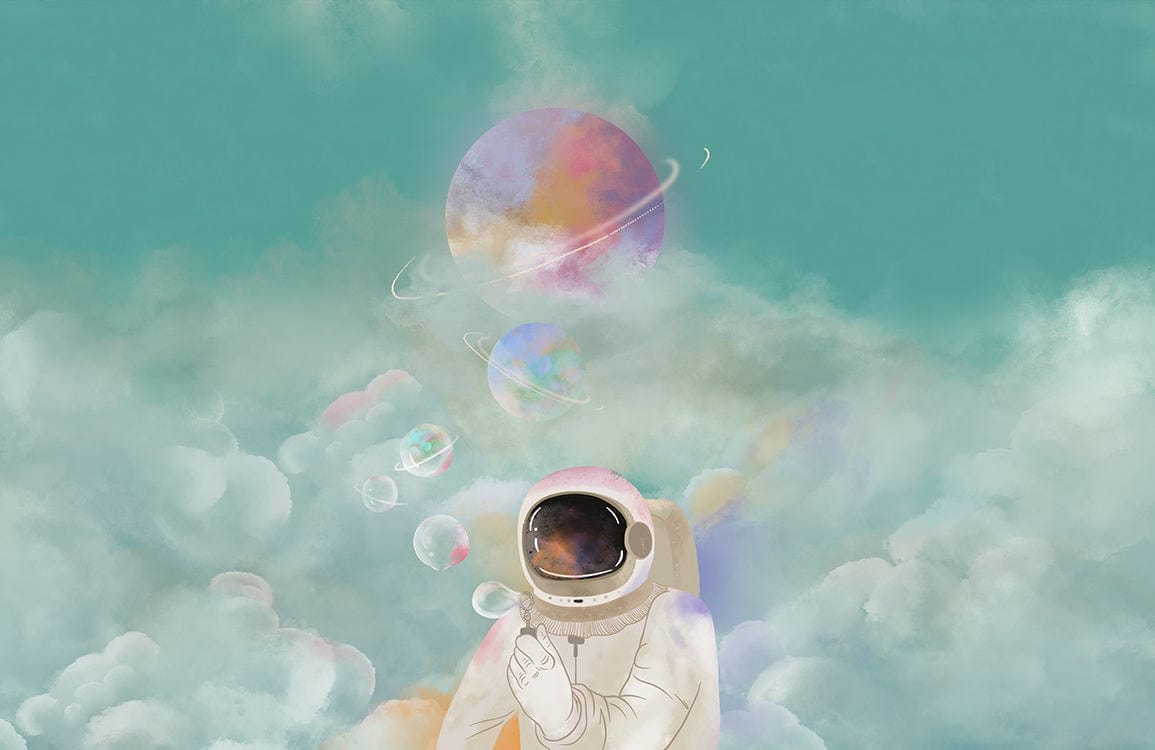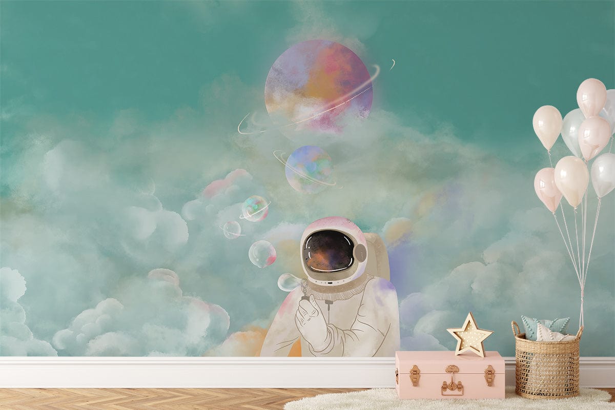 The Astronaut Roaming Wallpaper Mural artfully captures the whimsical essence of cosmic exploration, featuring an astral traveller amidst ethereal clouds and vibrant, abstract planets. A sophisticated balance of dreamy pastel hues against a celestial teal horizon creates a tranquil yet inspiring atmosphere suitable for diverse settings.