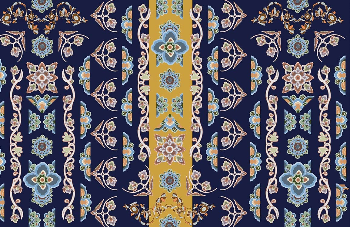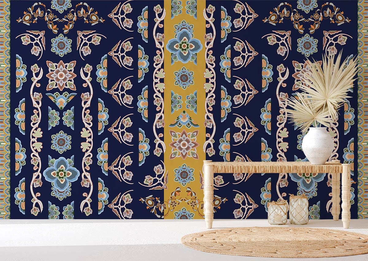 Introducing the Auspicious Flowers Wallpaper Mural, a masterpiece of intricate patterns and elegant flourishes. This stunning design marries bold, regal motifs with an artful blend of harmonious colours, creating a sophisticated backdrop suitable for any stylish interior. The mural's artistic detail and captivating textures evoke a sense of timeless elegance, making it a perfect fit for diverse spaces requiring a touch of refined charm.