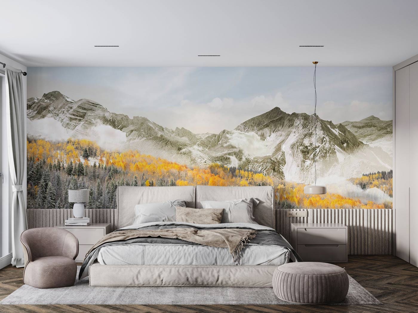 The Peak Wallpaper Mural captures a breathtaking mountain vista with an exquisite blend of autumnal golds, cool greys, and crisp whites. The intricate detailing of the distant peaks, brushed with a gentle snowfall, juxtaposes beautifully against the vibrant foliage, offering a subtle yet striking statement piece. Its sophisticated panorama provides a sense of serenity and timeless elegance, making it an ideal choice for both contemporary and classic interiors.