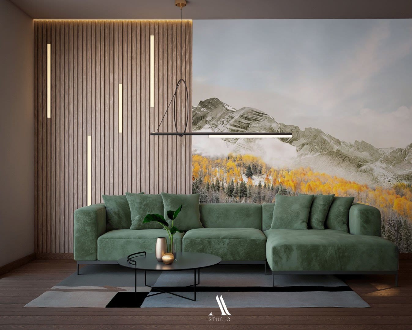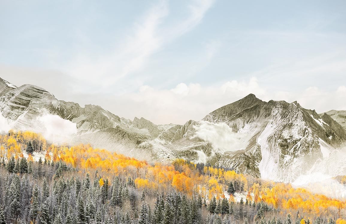 Adorn your wall with this magnificent autumn mountain wallpaper mural. Create an amazing feature wall in your interiors with this beautiful wall mural of the majestic mountain ranges awash with pastel blue sky and the rocky snowy peaks. Pair it with your modern furniture of your choice.
