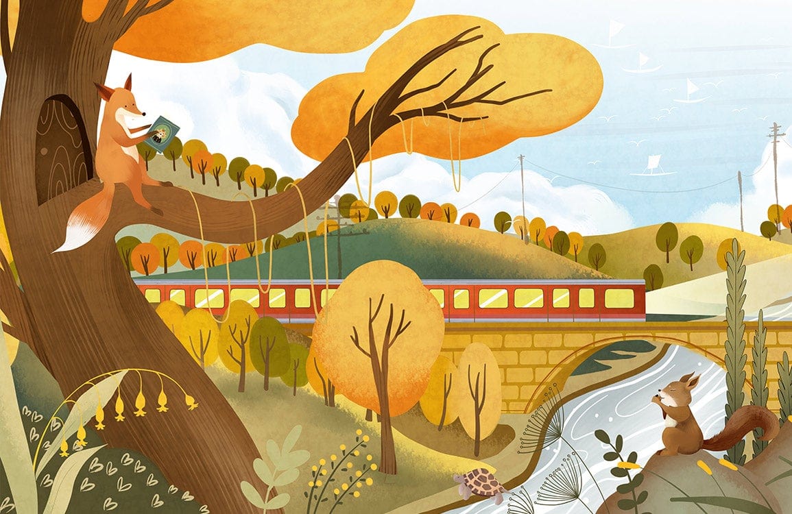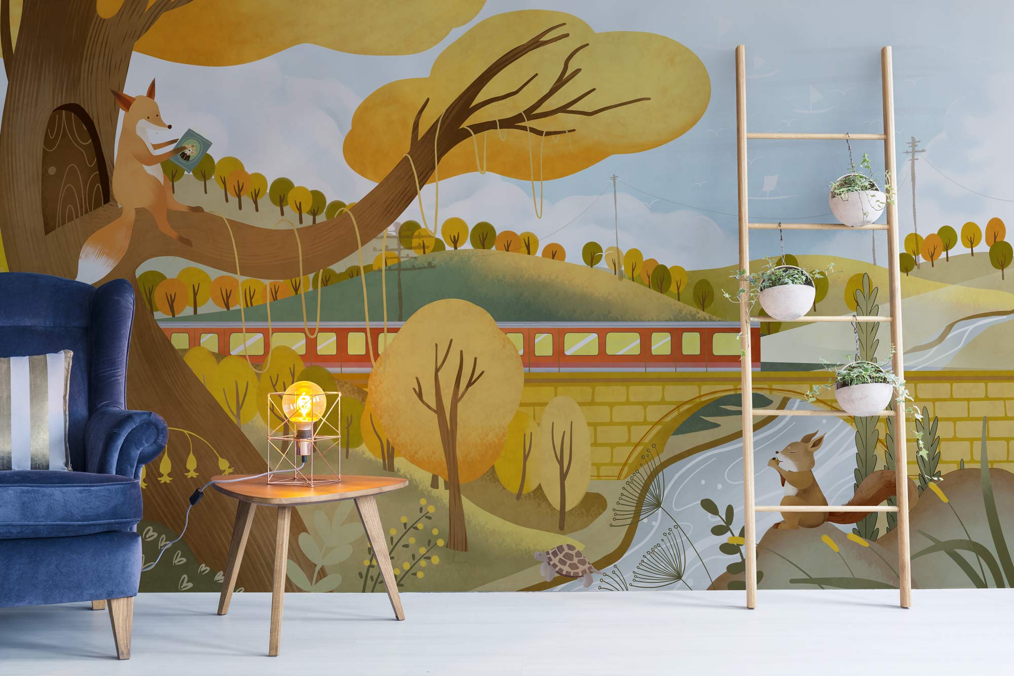 Step into a nostalgic journey with the Autumn Train Wallpaper Mural, where a whimsical train scene is painted across a serene landscape. Adorned with playful animals, gently rolling hills, and soft autumn foliage, this mural brings a charming tranquillity to any space. Its artistic detail evokes a timeless allure, merging simplicity with a touch of seasonal sophistication.