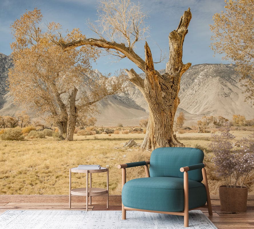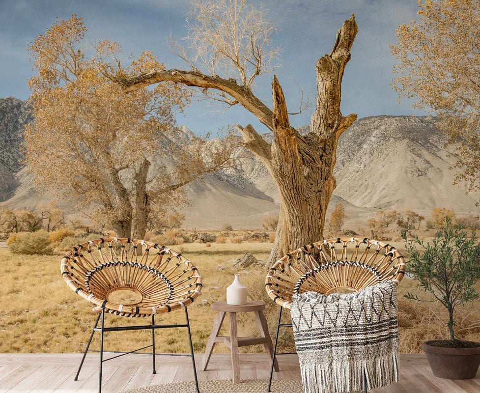 Embrace the serene beauty of nature with the Autumn Withered Plants Wallpaper Mural. This exquisite piece captures the majestic elegance of autumnal landscapes with meticulous artistry. Its design features intricate details of withered trees set against a backdrop of rolling mountains, evoking a sense of calm and sophistication. The mural's texture brings depth, making it an elegant addition to diverse interior spaces.