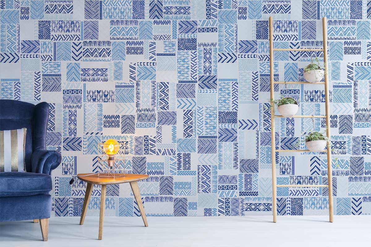 Bring an exotic look to any interior with the Aztec patchwork pattern wallpaper. Inspired by antique textiles, the modern design has a custom patchwork in shades of blue that adds rich detail to walls with just enough geometric shapes. This mural wallpaper features an intricate patchwork pattern of Aztec-inspired tiles and will instantly add interest to your space. And for the final touch, the hand-glazed finish offers a unique texture that enhances the overall design of the mural.