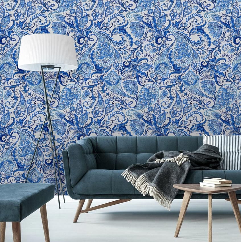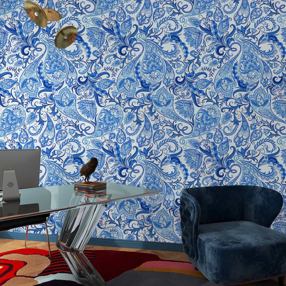 The Azure Paisley Elegance Mural Wallpaper showcases a delicate tapestry of intricate paisley designs, seamlessly blending shades of azure and cobalt. Its refined pattern exudes a timeless sophistication, ideal for adding an artistic touch to dining rooms, bedrooms, or chic office spaces. The subtle textural elements invite a sense of depth and quiet elegance, making it a perfect choice for those seeking a fusion of classic and contemporary styles.