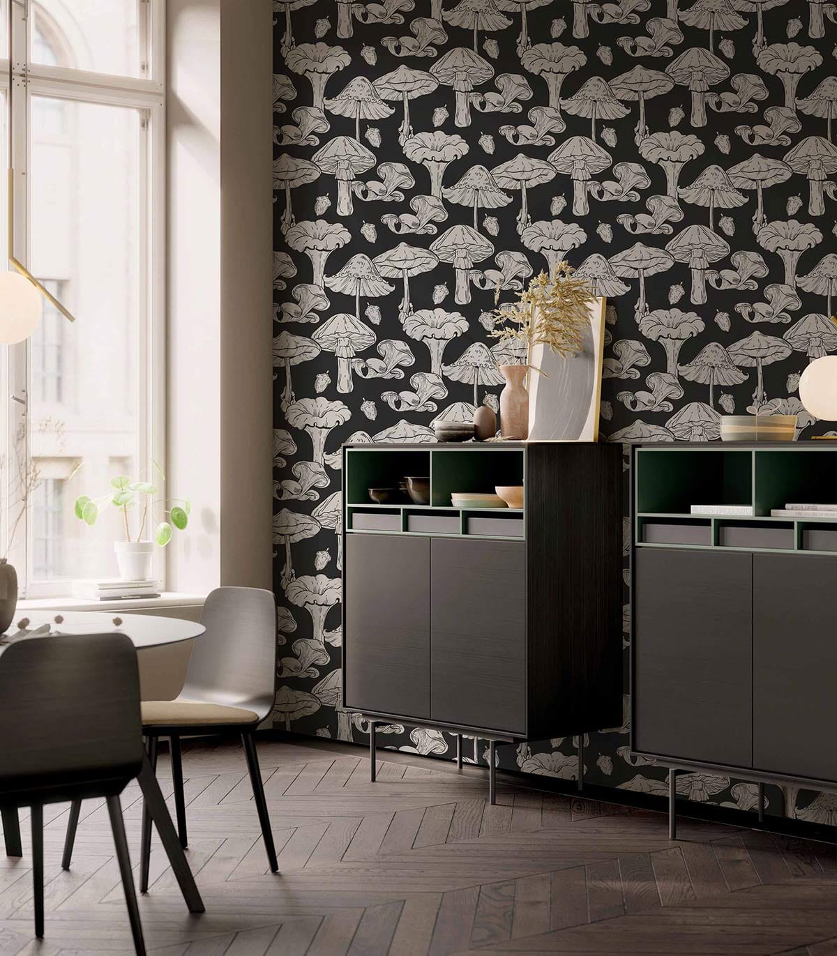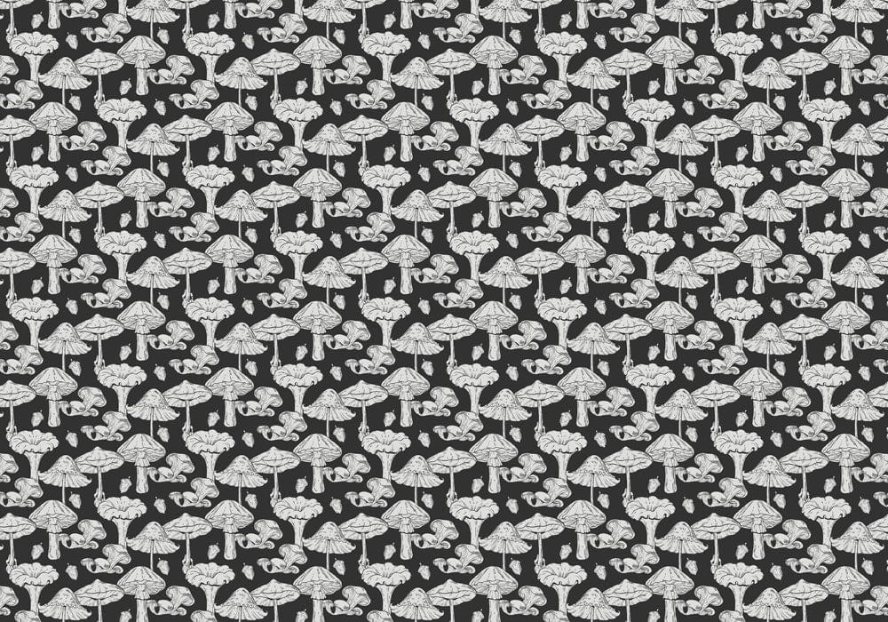 Embrace a world of whimsy with the Black Mushrooms Wallpaper Mural, where intricate mushroom motifs delicately unfold across a deep charcoal backdrop, offering a stunning balance of nature-inspired art and refined elegance. This mural captures the eye with its intricate linework and calming palette, making it a perfect addition to a myriad of spaces, from contemporary living rooms to serene study nooks.