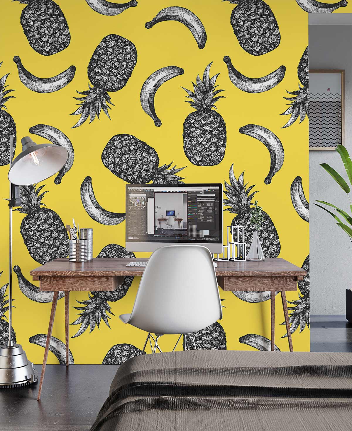 Immerse your space in the lush charm of tropical allure with our Banana & Pineapple Wallpaper Mural. The intricate black and white sketches of bananas and pineapples create a striking contrast against a bold yellow backdrop, offering a blend of whimsy and sophistication. This exquisite design is perfect for infusing a sense of freshness and artistic elegance into any interior, promising an inviting and timeless appeal that complements a wide array of styles.