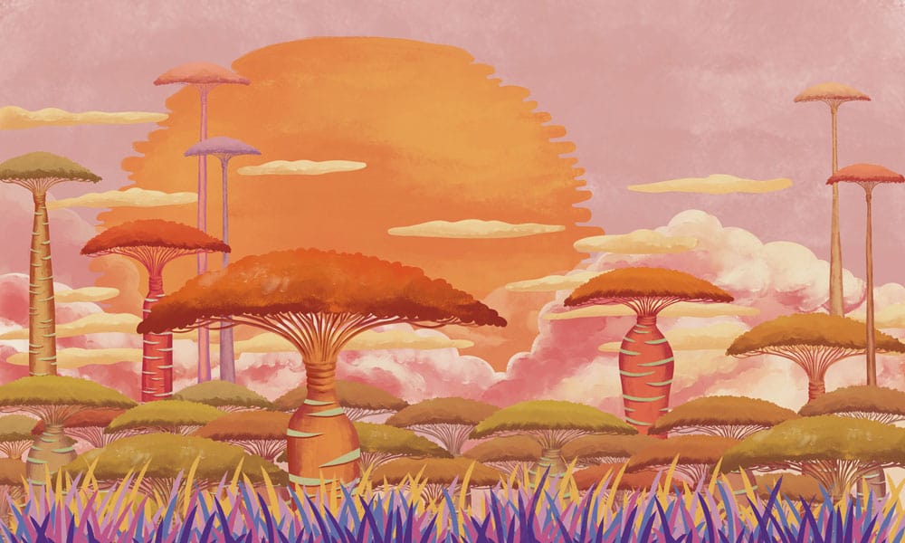 Discover the enchanting allure of the Baobab & Purple Grass Wallpaper Mural, where majestic baobab trees rise against a sunset-hued sky, enveloping any room in vivid serenity. The intricate interplay of warm orange and deep purple captures nature's whimsical essence, while the gentle textures create a timeless backdrop. This mural effortlessly fits into eclectic and bohemian spaces, offering a vibrant yet sophisticated statement.