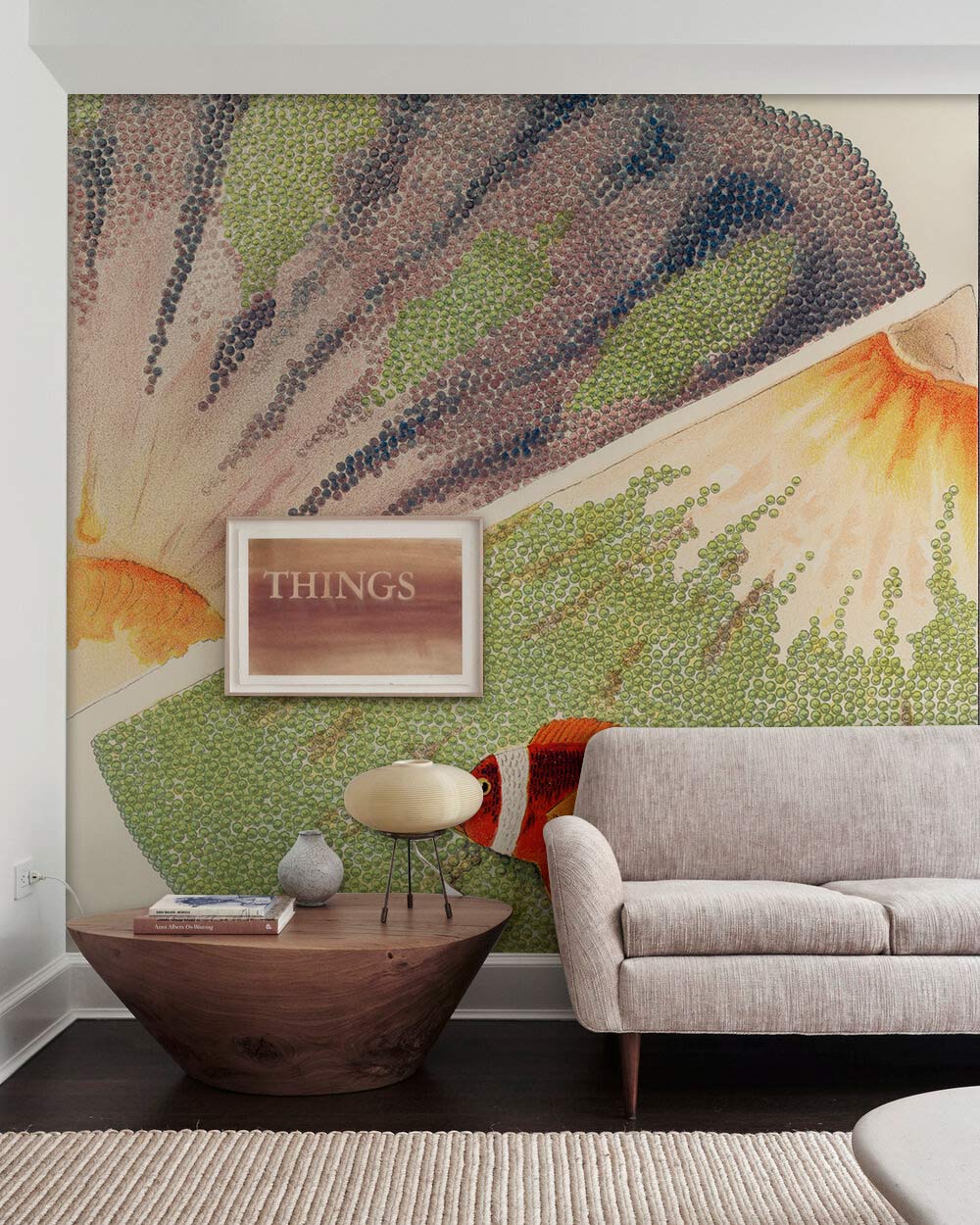 Remember the very popular scene from finding Nemo? when his father used to take care if the un grown kids? this mural wallpaper will look really familiar to that scene and will take you back to very nice memories from many years ago. This mural wallpaper with its bright shades will make a bright bedroom with nice vibes for your kids. Also, if you are looking for a different and modern and chic looking at your living room this wallpaper will be one of the best choices with modern furnishing and fluffy green carpet.