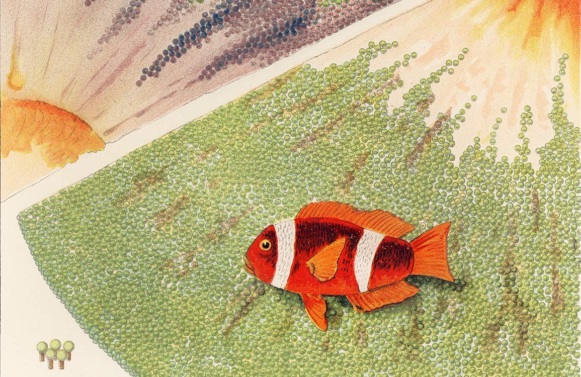 The Barrier Reef Anemones Wallpaper Mural presents an exquisite underwater tableau, blending intricate aquatic imagery with a gentle, sunlit palette. A striking clownfish navigates through lush green anemones, evoking a serene and timeless marine escape. Ideal for creating a sophisticated yet organic ambiance in a variety of interiors.