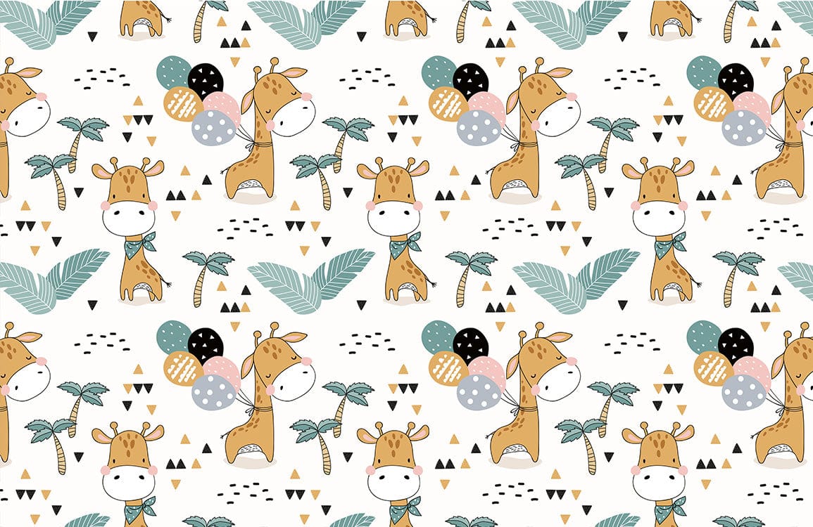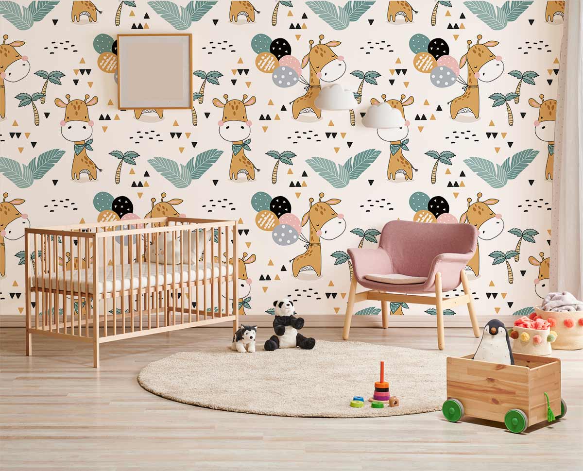 Give a child's bedroom scene a fresh, happy look with this charming Giraffe and Balloons Mural Wallpaper. This happy animal wallpaper is perfect for both children's rooms and adult's rooms as it creates a feeling of relaxation, health, and beauty. A cheery design that reminds us of the days of our youth, it's sure to be a charming addition to any child's room. It offers a colourful alternative for your child's walls without overwhelming their space.